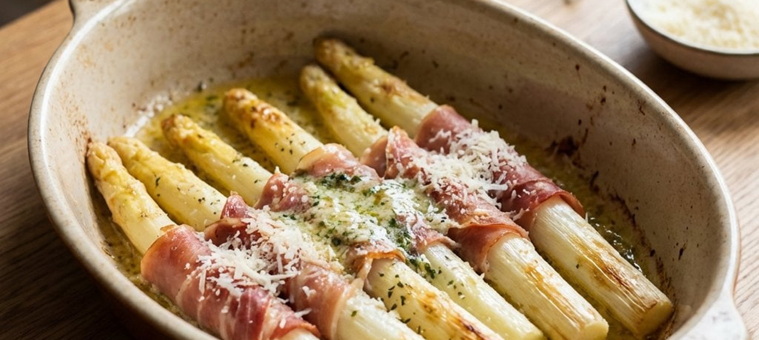 - 1Jeweils 2-3 Spargelstangen mit einer Scheibe Parmaschinken umwickeln und nebeneinander in eine gefettete Auflaufform legen. Mit etwas weißem Pfeffer würzen, mit dem geriebenen Parmesan und dem restlichen Zitronenabrieb bestreuen. Die vorbereitete Kräuterbutter in Flöckchen auf dem Spargel verteilen. Im vorgeheizten Ofen ca. 15 Minuten goldbraun überbacken.