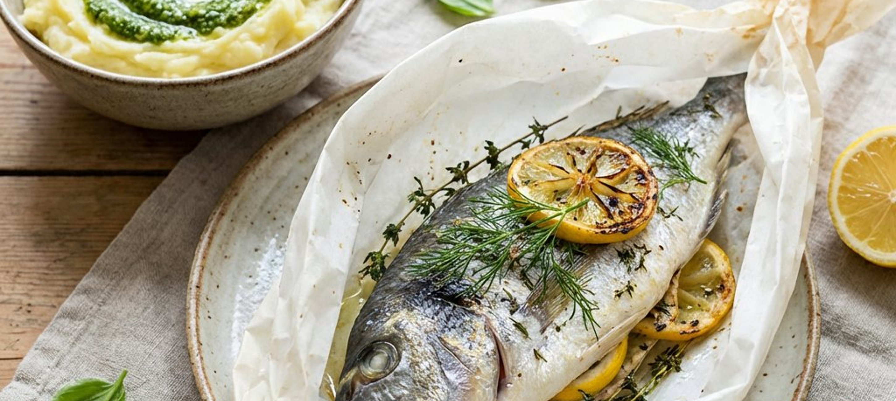Die Goldbrasse in der Papillote lässt sich im Sommer auch hervorragend auf dem Grill zubereiten. Achten Sie darauf, dass das Päckchen gut verschlossen ist, damit der Fisch im eigenen Saft dämpft.