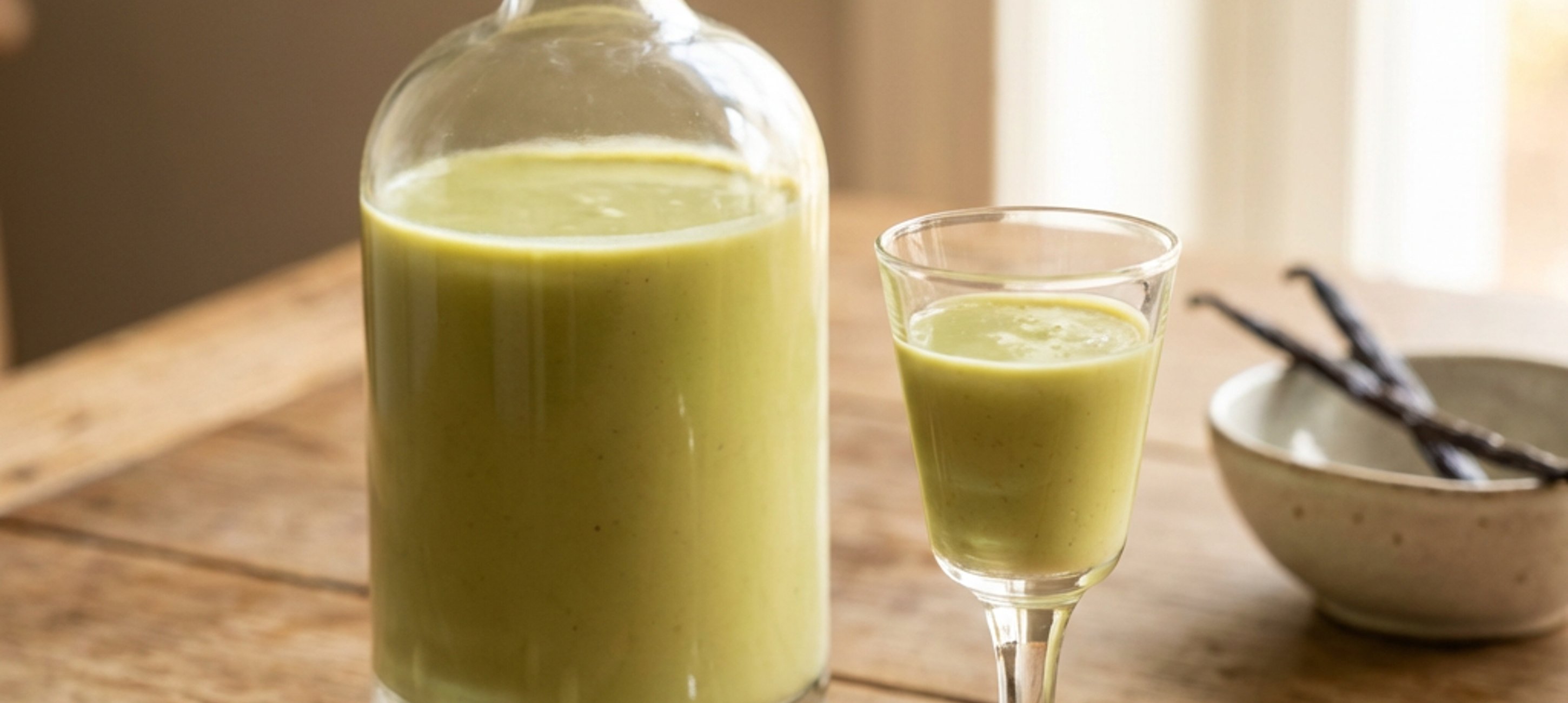 - 6In den lauwarmen Pudding die Pistazien-Butter, das Schlagobers und den Rum einrühren, bis eine glatte Likörmasse entsteht. Den fertigen Likör in Flaschen füllen und mindestens 48 Stunden im Kühlschrank ziehen lassen.