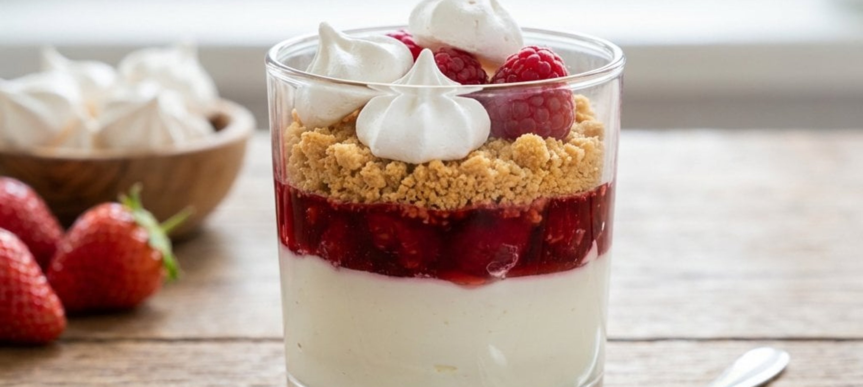 - 1Butterkekse grob zerbröseln. Abwechselnd Kekse, beide Cremes, Weichsel-Gelee und frische Beeren in Gläser schichten. Mit Baisers und Früchten garnieren.