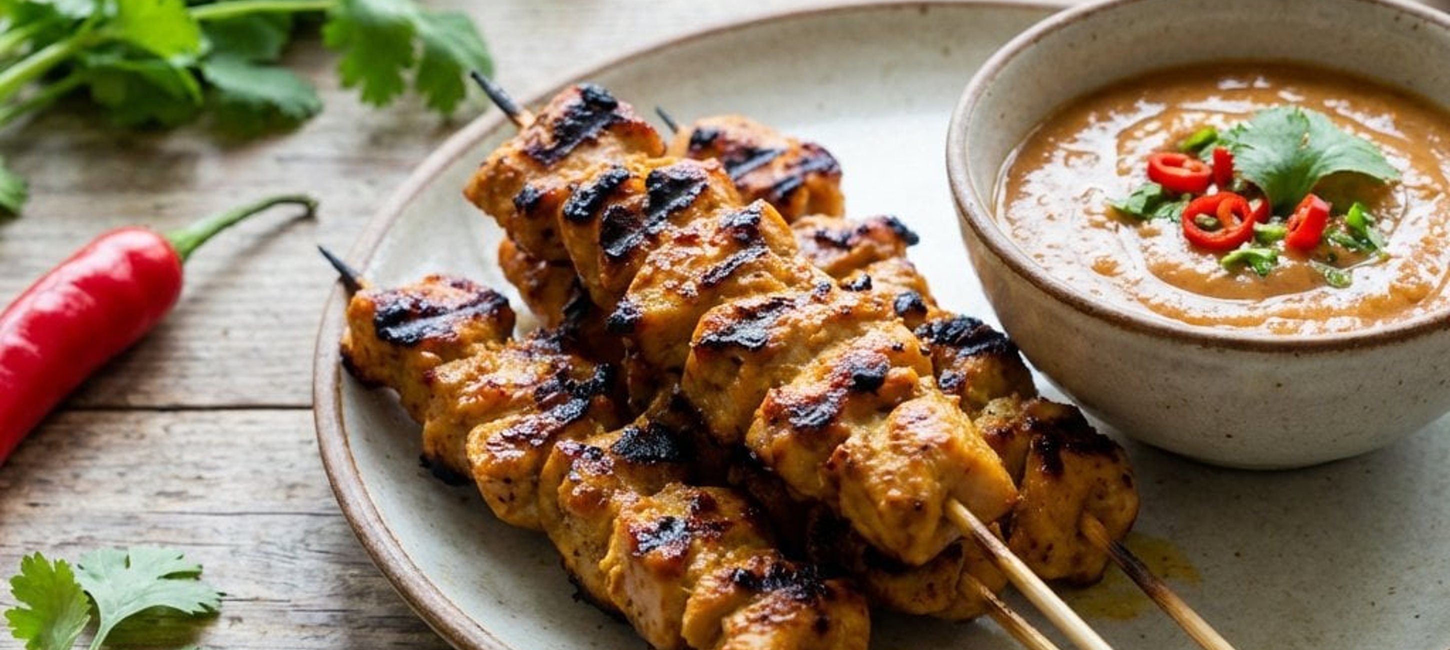 - 3Die fertigen Hendl-Spieße auf Tellern anrichten und zusammen with der cremigen Erdnusssauce servieren. Guten Appetit!