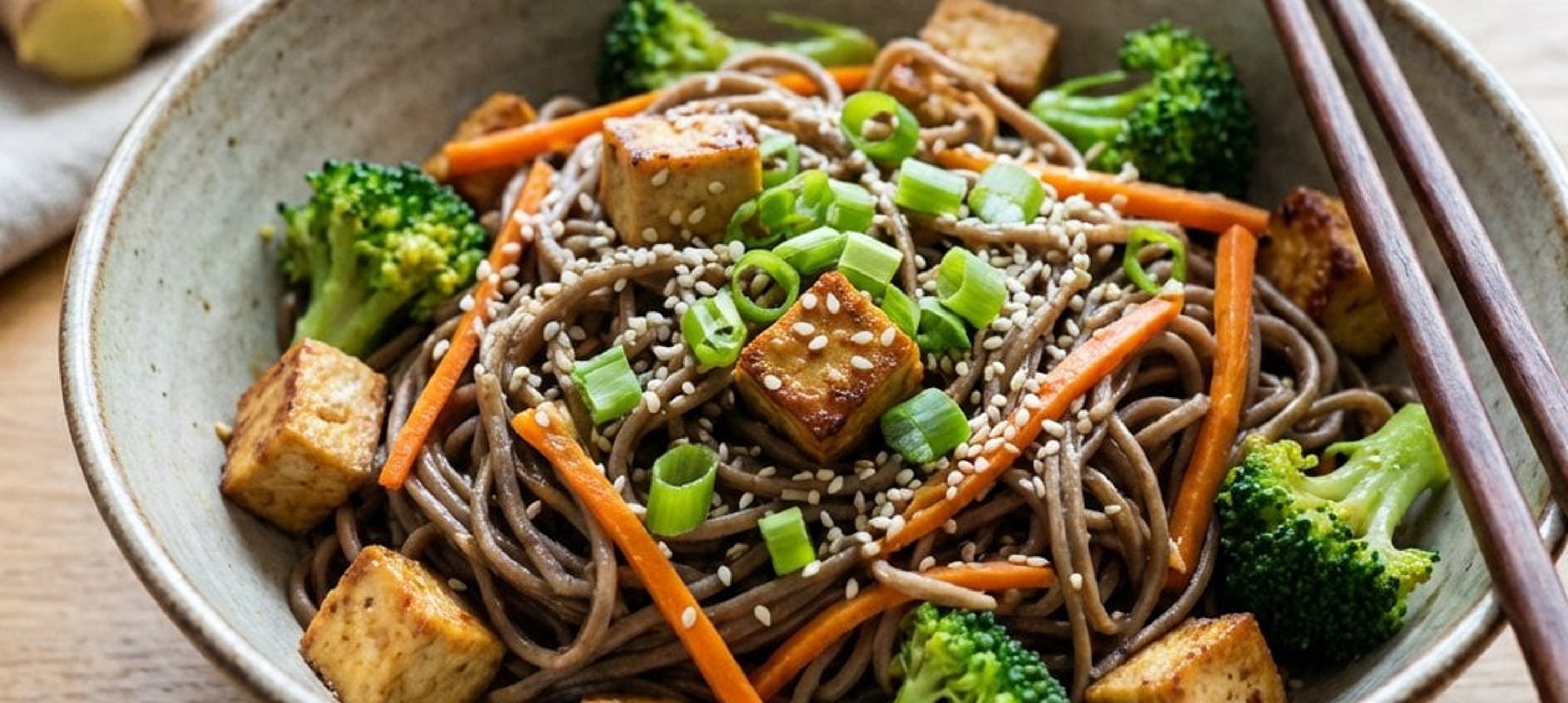 - 5Den in Würfel geschnittenen Tofu, die gekochten Soba-Nudeln, die in feine Stifte geschnittene Karotte und die restliche Sauce hinzufügen. Alles gut vermengen und kurz miterhitzen.