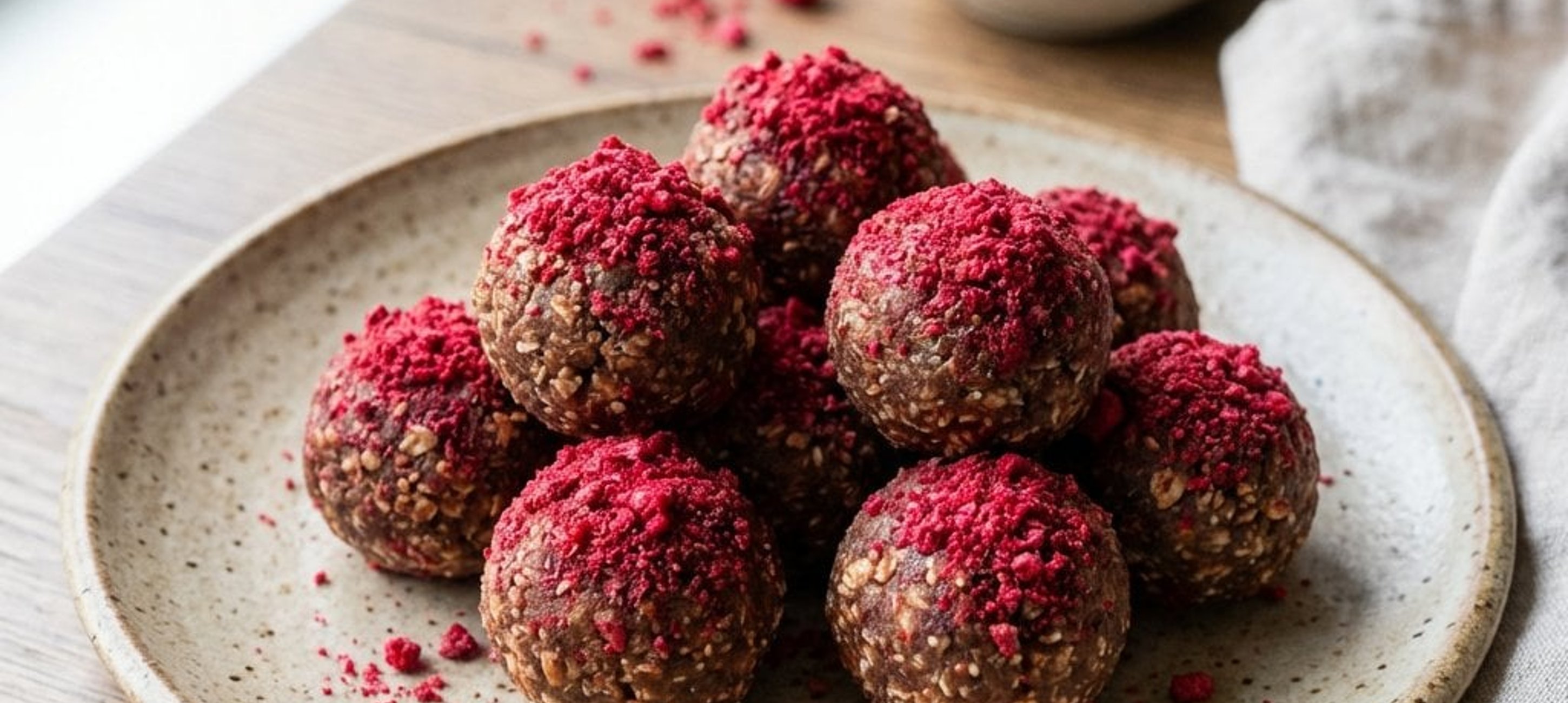 - 2Formen Sie aus der Masse kleine Bällchen. Zerbröseln Sie die gefriergetrockneten Himbeeren leicht und wälzen Sie die Bällchen darin, bis sie gleichmäßig bedeckt sind. Alternativ können Sie auch gehackte Nüsse wie Pistazien verwenden.