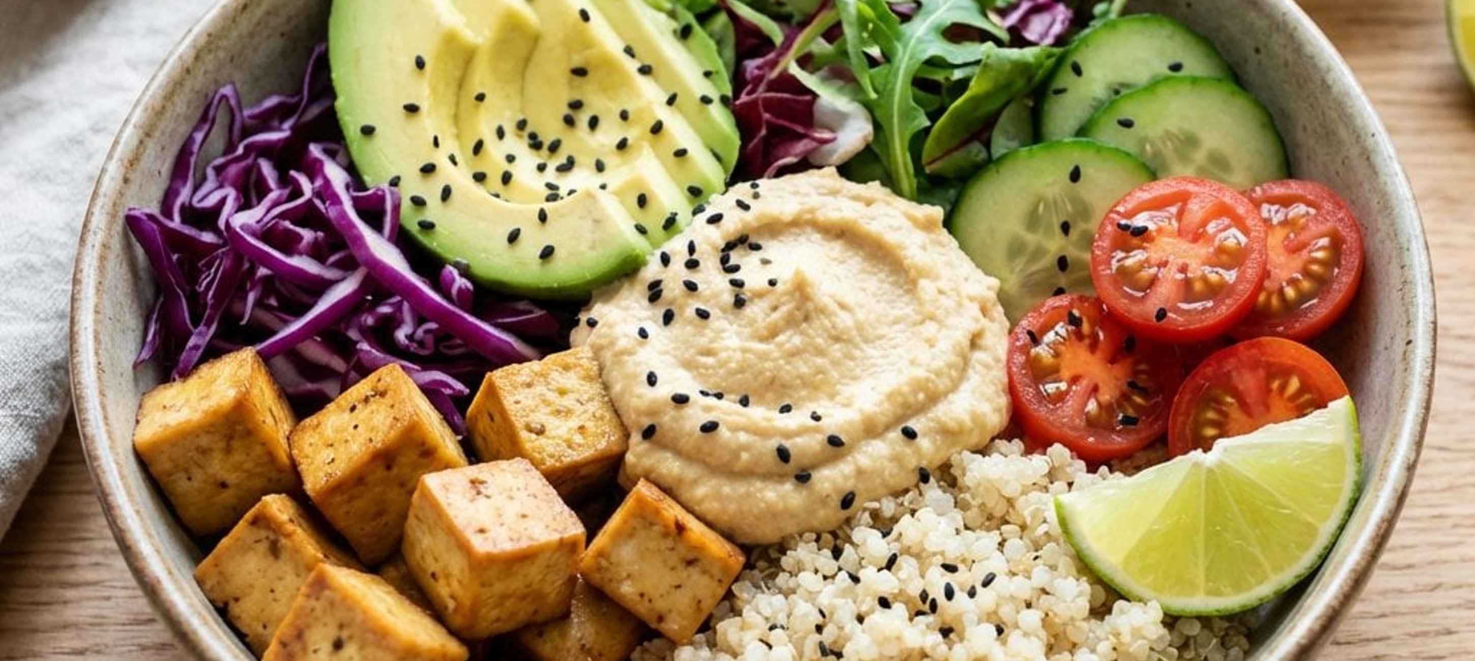 Ein Spritzer frischer Limettensaft am Ende hebt die Aromen des Hummus und des gebackenen Tofus perfekt hervor. Für eine extra nussige Note können Sie die Quinoa vor dem Kochen kurz trocken in der Pfanne anrösten.