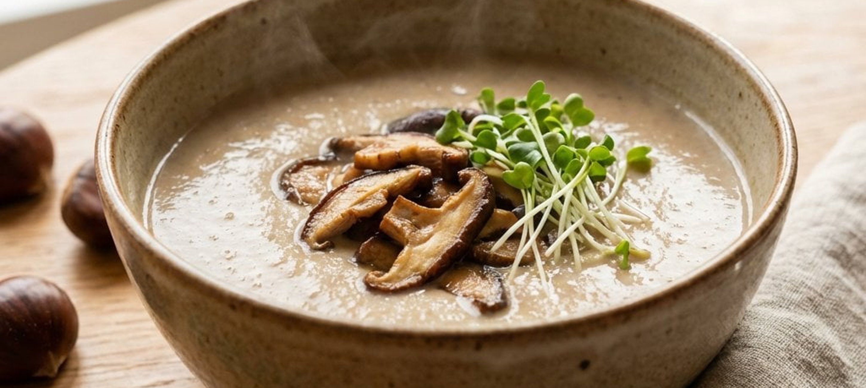 - 5Die cremige Suppe in Tellern anrichten und mit den gebratenen Shiitake-Pilzen sowie den Radieschensprossen garniert servieren.