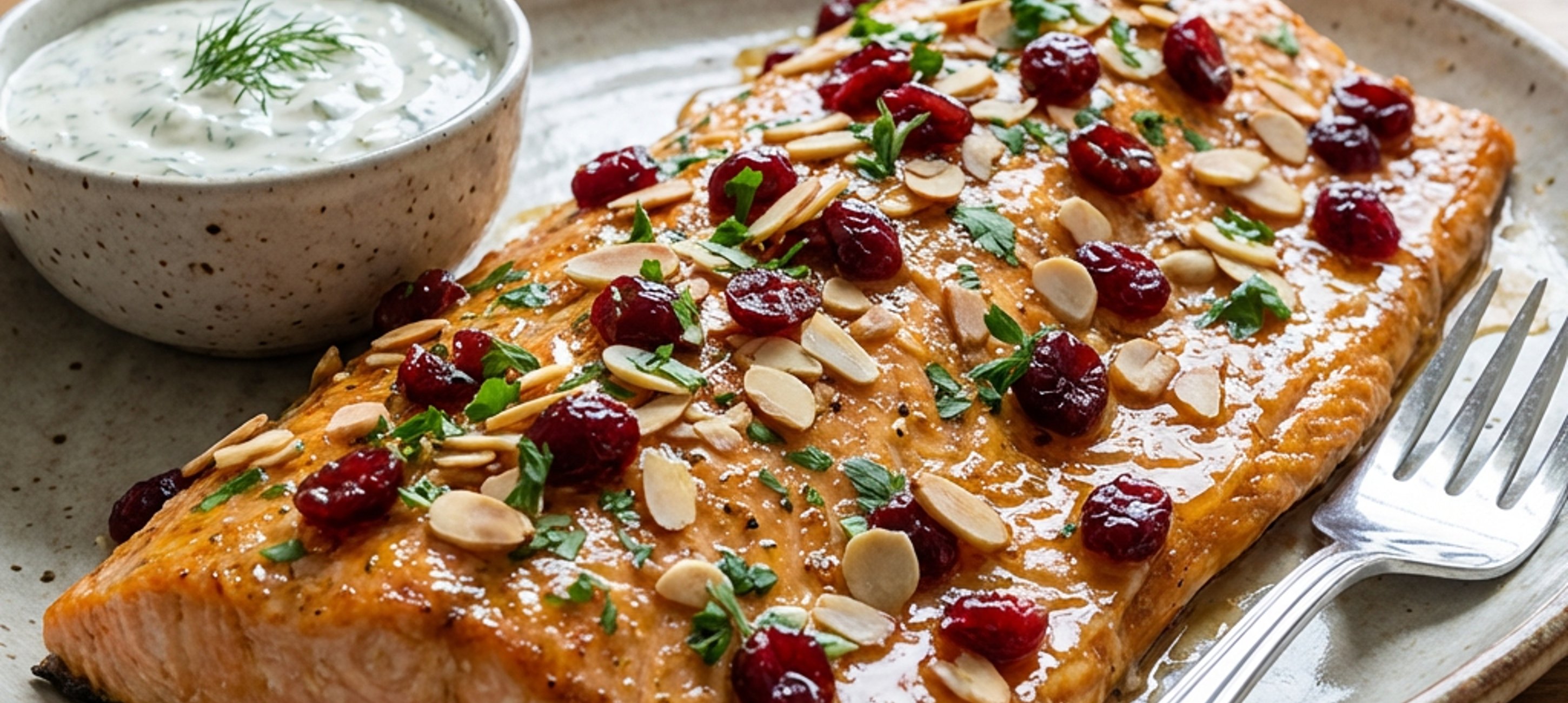 - 1Lachs sofort auf eine Servierplatte ziehen, locker abdecken und mindestens 15 Minuten rasten lassen. Mit Dillsauce, Cranberry-Mischung, Granatapfelkernen, frischer Petersilie und Zitronenspalten servieren.