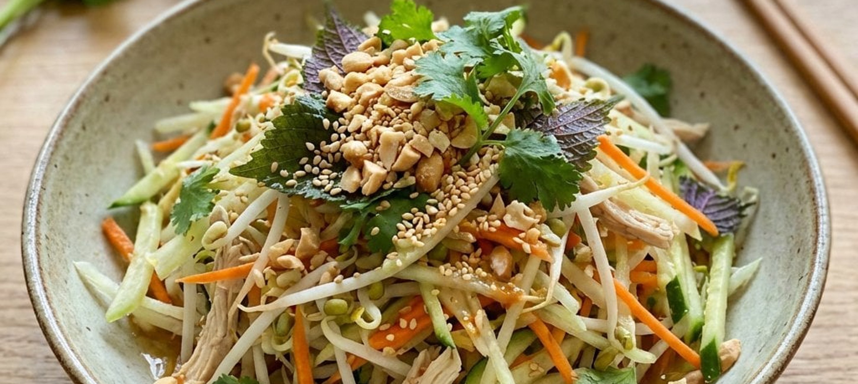 - 1Die Hendlbrust in Wasser mit einer Prise Salz, den Ingwer-Scheiben und den Kaffirlimettenblättern kochen. Das fertig gegarte Fleisch abkühlen lassen und in feine Stücke zupfen.
