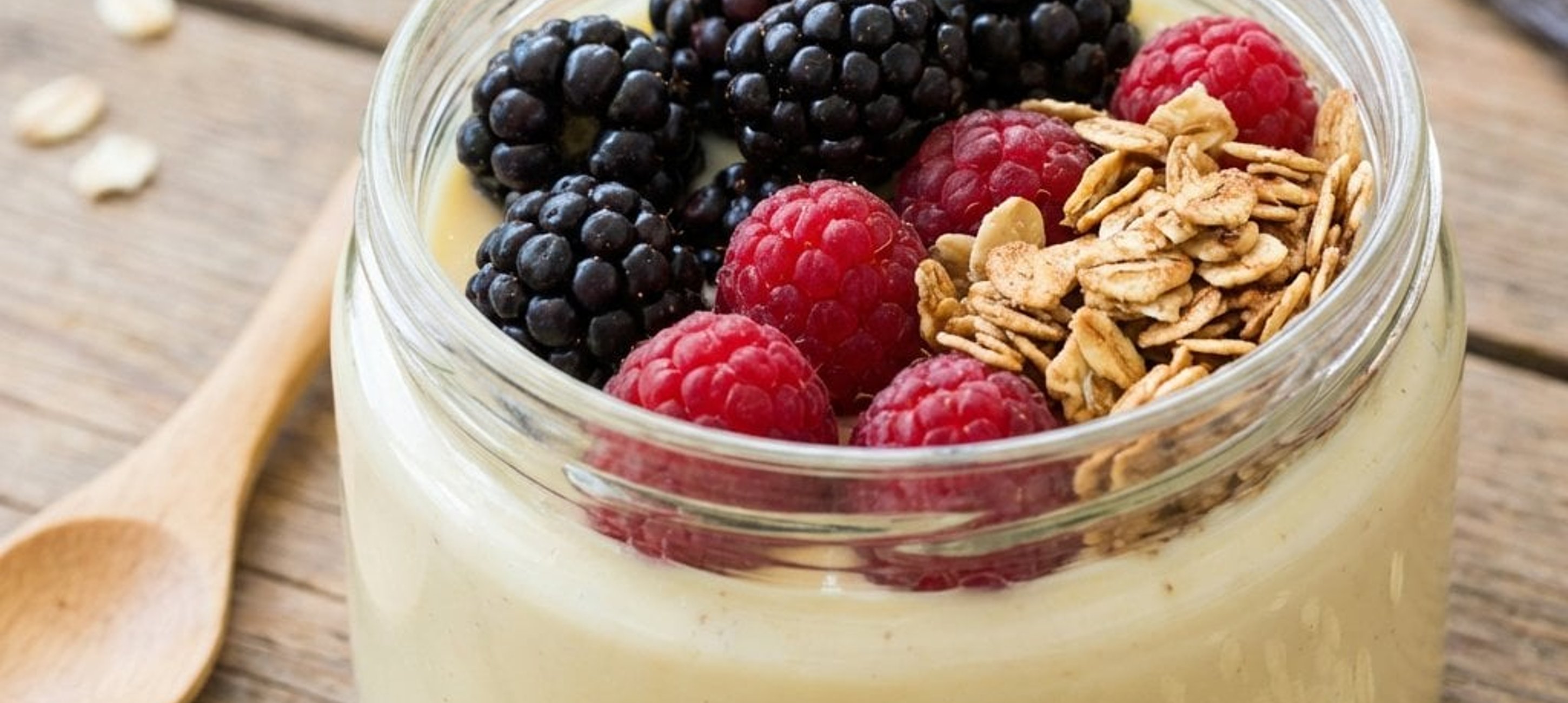 - 2Vier Gläser bereitstellen. Den noch warmen Pudding in die Gläser füllen. Die gerösteten Haferflocken und die gewaschenen Waldbeeren dekorativ darauf schichten.