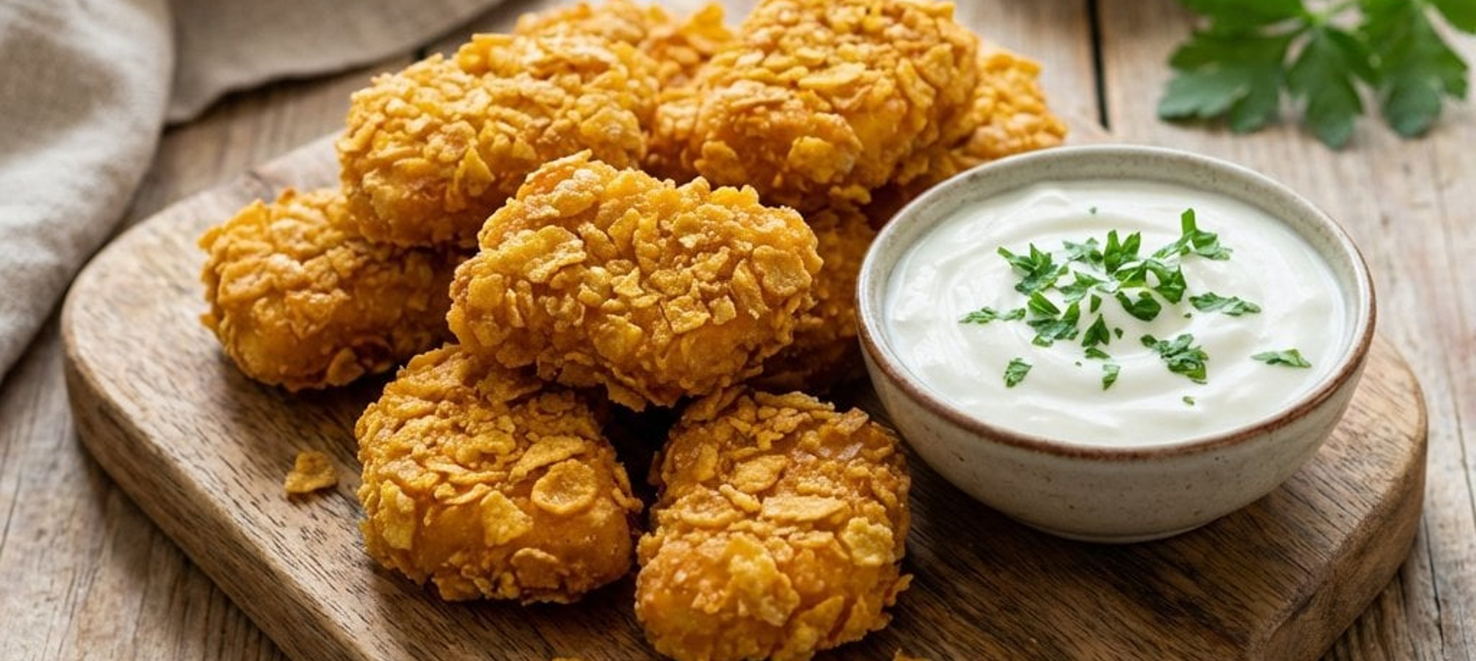 - 2Die marinierten Hendlstücke einzeln in den Cornflakes-Bröseln wenden, die Panier leicht andrücken und die Nuggets auf das vorbereitete Backblech legen.