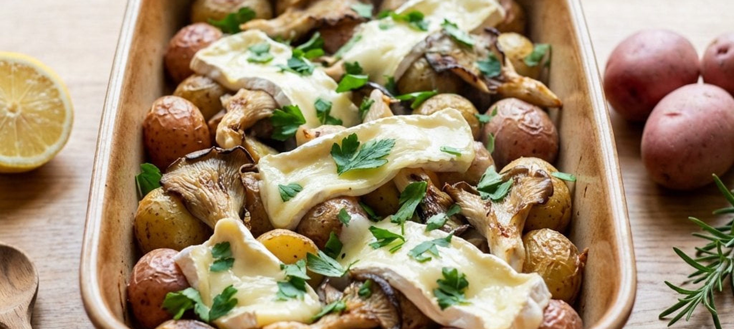 - 1Den Backofen auf 180 °C vorheizen (am besten Grillfunktion). Die Erdäpfel waschen, die Schale dranlassen. Kleine Erdäpfel ganz lassen, größere halbieren. Austernpilze putzen, die Wurzelenden entfernen und in kleinere Stücke schneiden. Schalotten schälen, halbieren und längs vierteln.