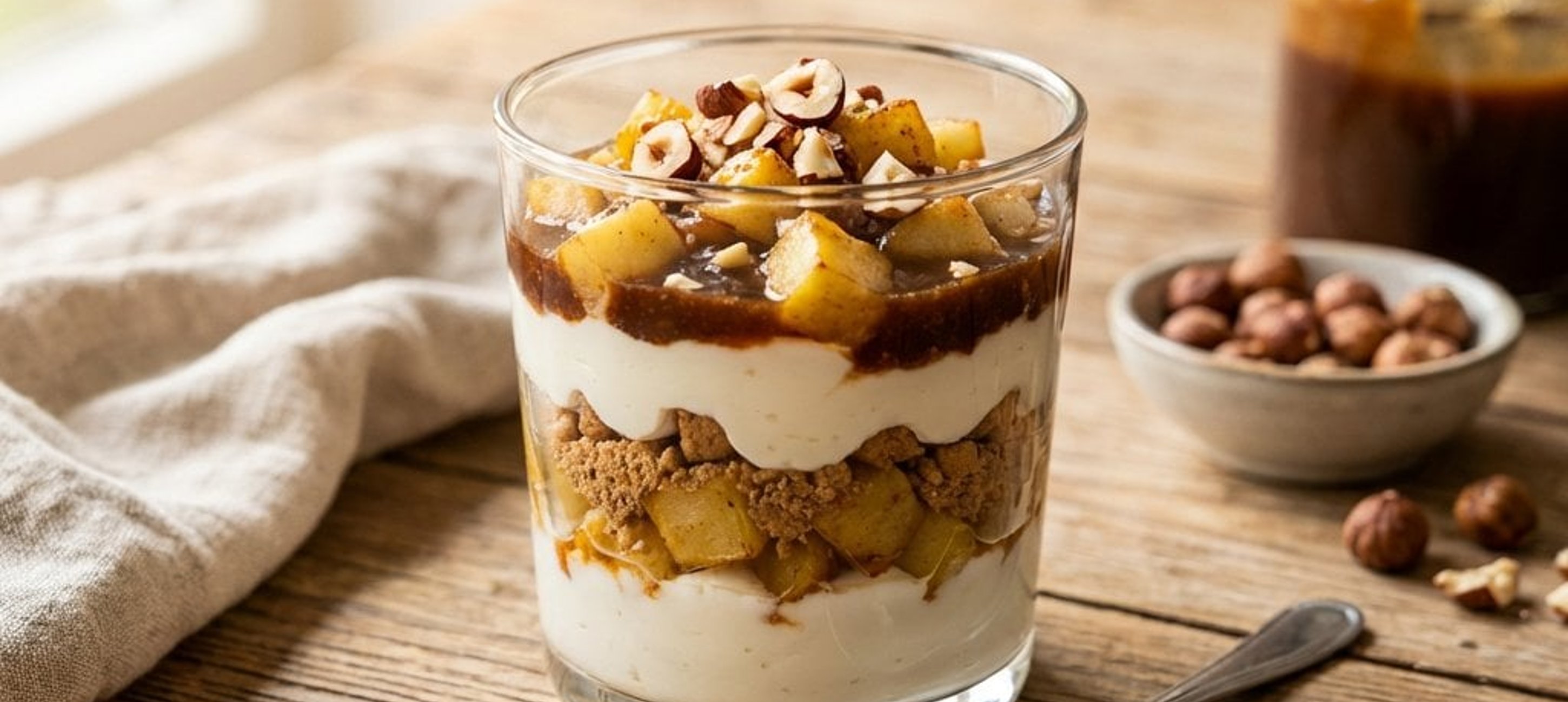 - 2Zum Schichten zuerst einen Teil der Topfencreme in die Gläser füllen. Darauf die Keksbrösel verteilen, etwas Dattelkaramell darübergeben und mit einem Teil der gerösteten Äpfel bedecken. Eine weitere Schicht aus restlicher Creme, Dattelkaramell und Äpfeln daraufgeben. Zum Schluss das Dessert mit grob gehackten Haselnüssen bestreuen.