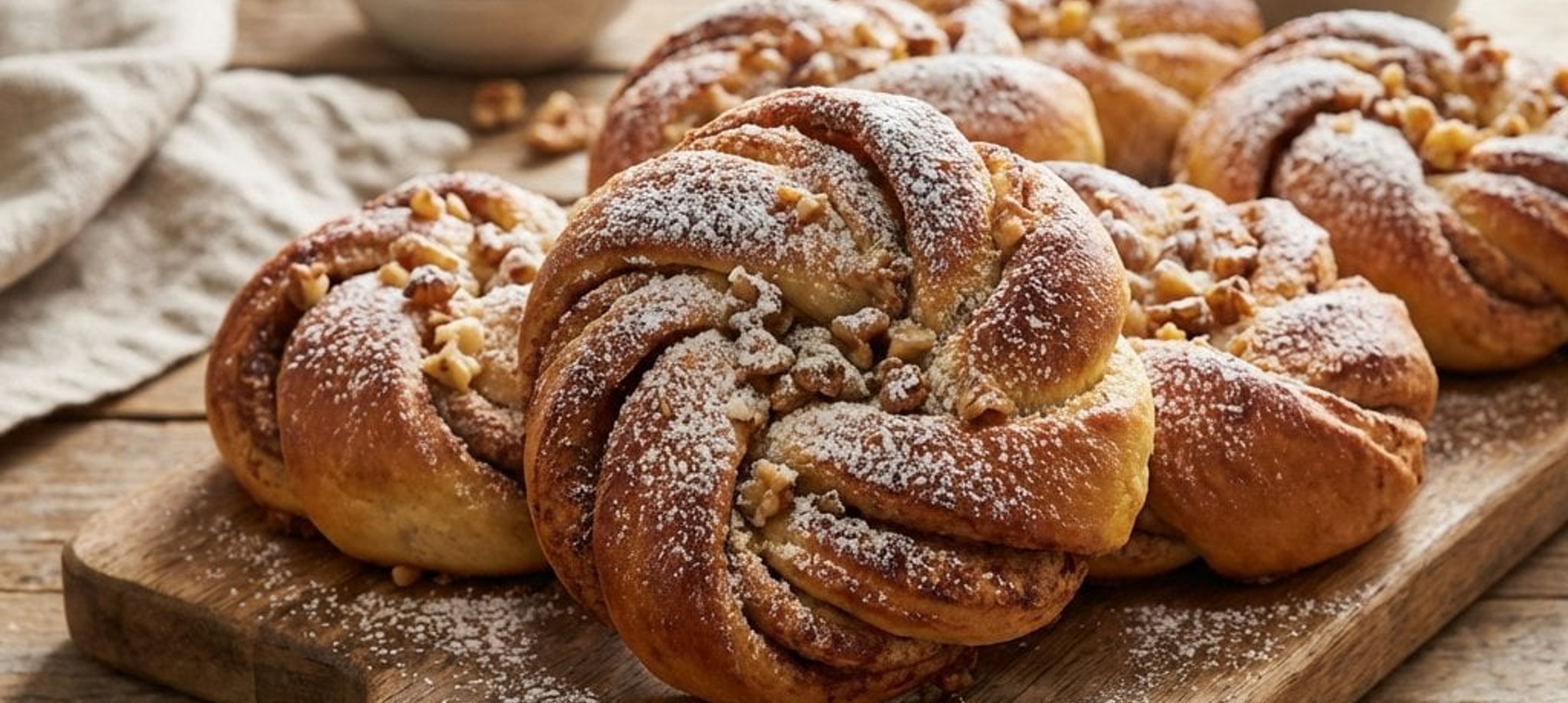 - 1Die Zimtknoten locker mit Folie abdecken und nochmals ca. 30-40 Minuten an einem warmen Ort gehen lassen. Im vorgeheizten Backrohr bei 180 Grad (Ober-/Unterhitze) ca. 25 Minuten goldbraun backen.