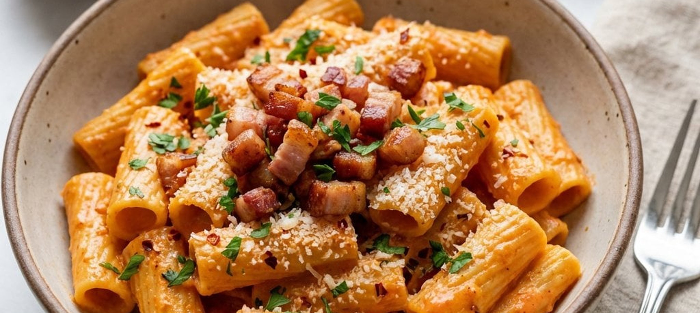 - 4Die abgetropften Rigatoni mit der Sauce, der knusprigen Pancetta und der gehackten Petersilie vermengen. Mit frisch geriebenem Parmesan bestreuen und sofort servieren.