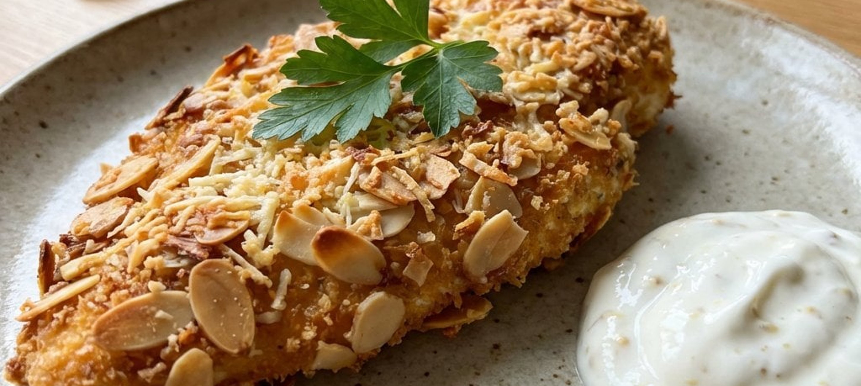 - 4Die Hendlschnitzel zuerst großzügig in der Joghurt-Ei-Mischung wenden und anschließend in der Mandel-Halloumi-Mischung panieren, dabei die Kruste leicht andrücken. Die Schnitzel auf das vorbereitete Backblech legen.