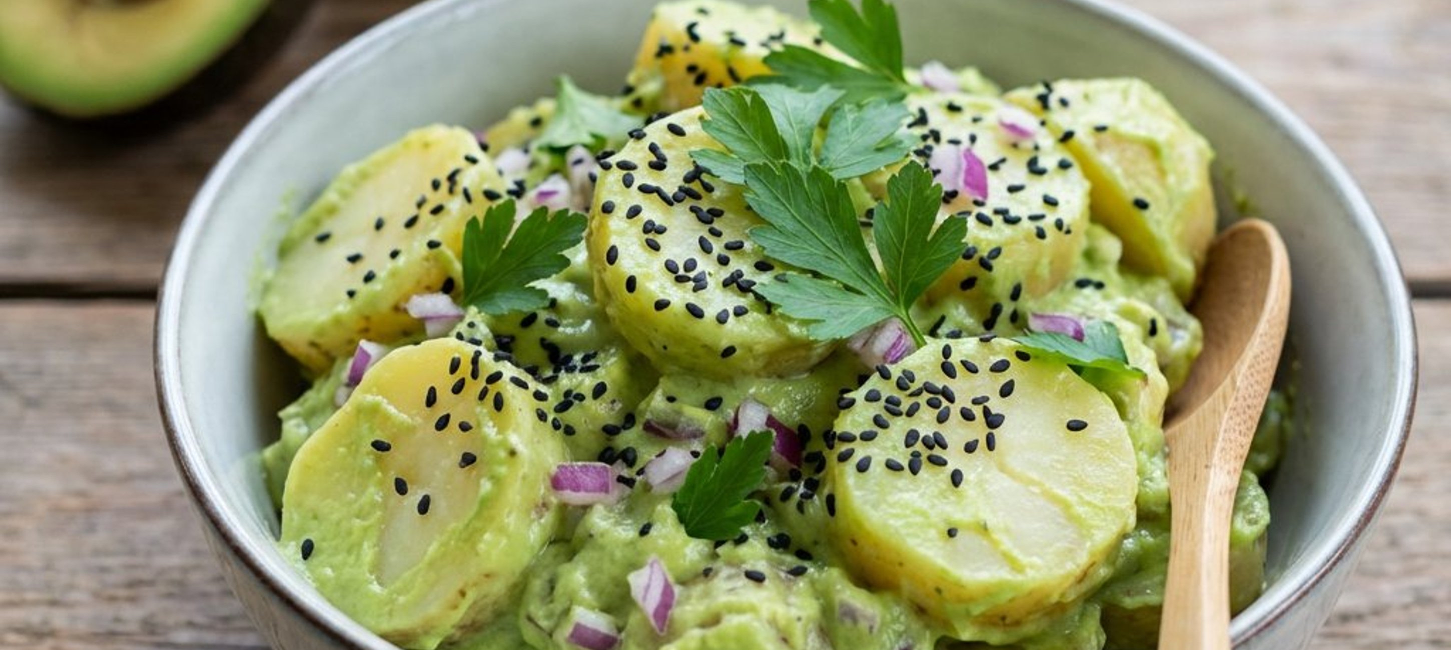 - 2Die geschnittenen Erdäpfel, die Zwiebelwürfel, die gehackte Petersilie und die schwarzen Sesamsamen zum Avocado-Püree geben und alles vorsichtig, aber gründlich vermengen.