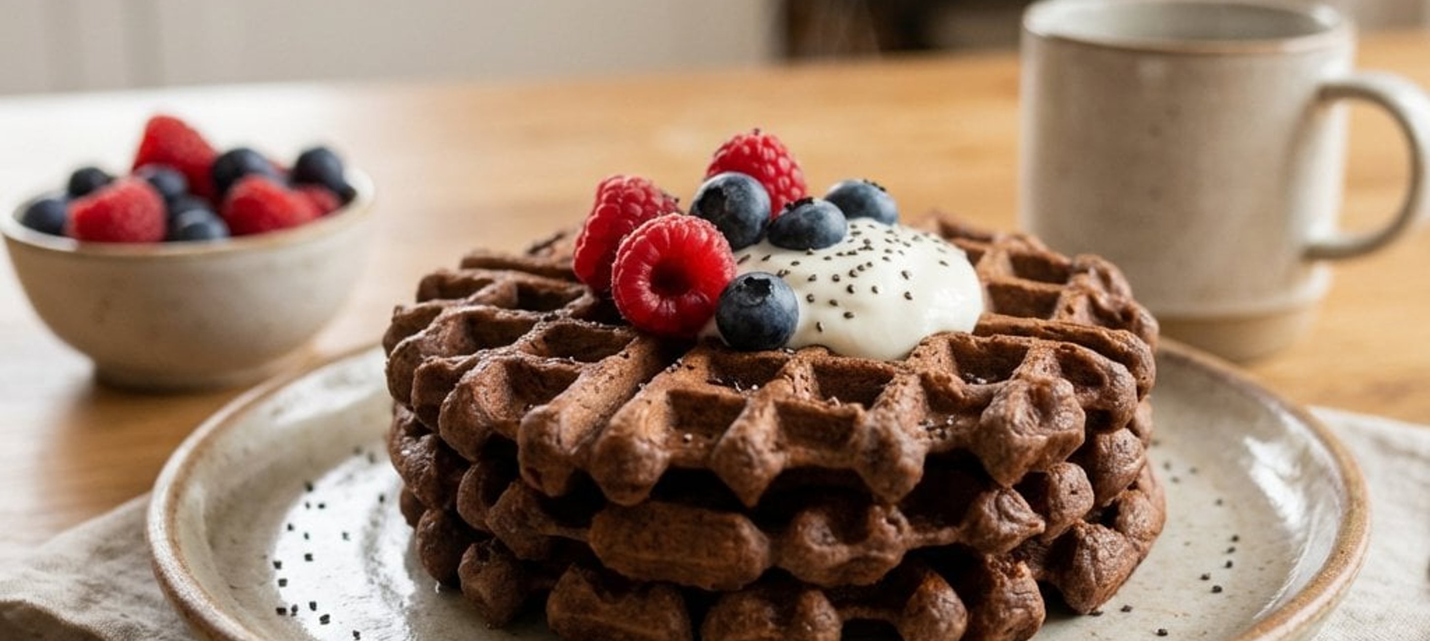- 2Die warmen Schokoladenwaffeln mit einem Klecks Sauerrahm und den (aufgetauten) Beeren garnieren und sofort genießen.