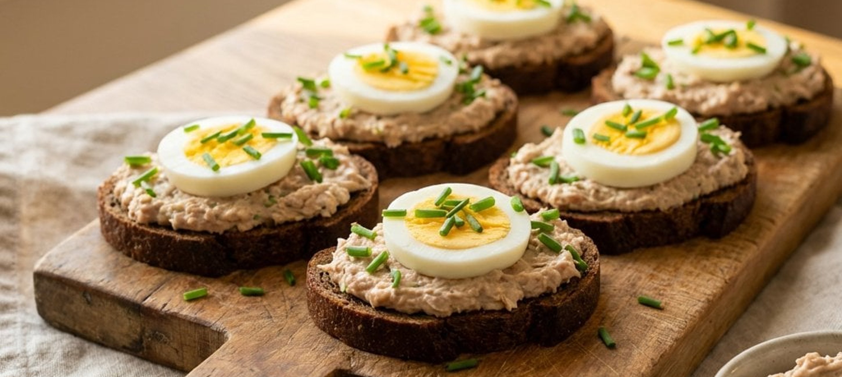 - 5Die hartgekochten Eier schälen und in Scheiben schneiden. Die Canapés mit je einer Eischeibe und dem restlichen Schnittlauch garnieren.