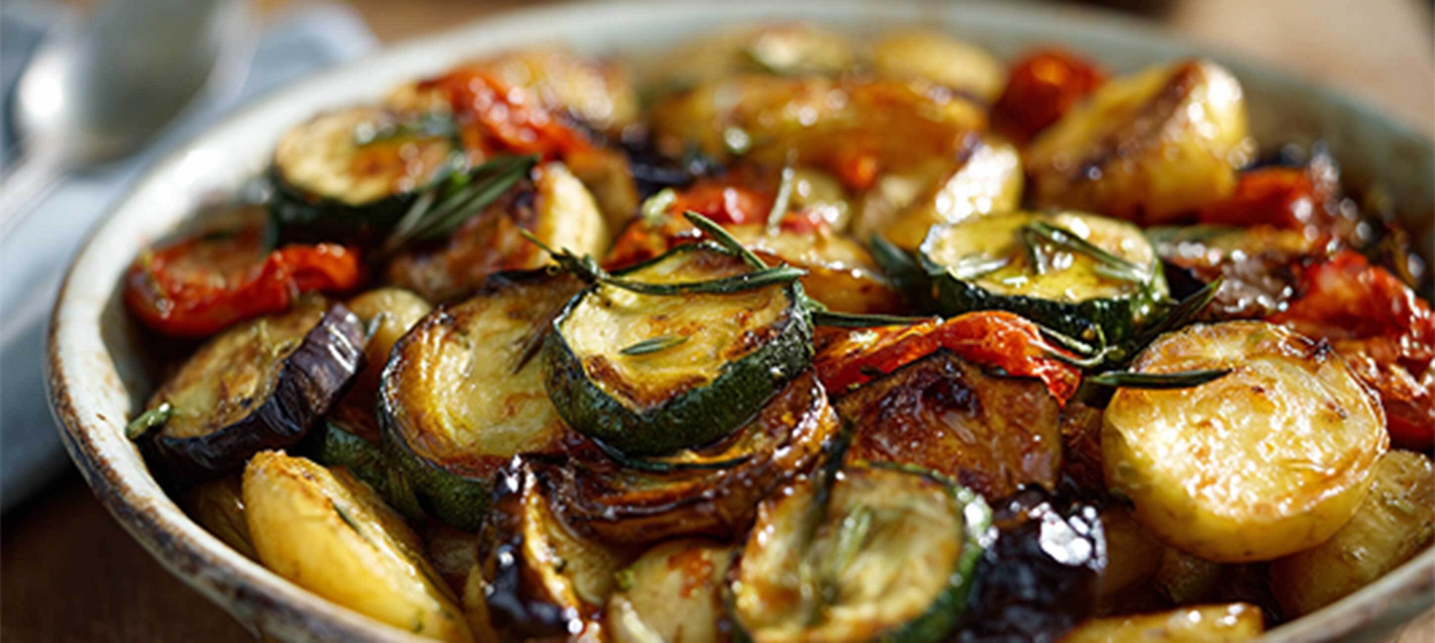 - 1Backofen auf 190 °C (Ober-/Unterhitze) vorheizen. Gemüse (Tomaten, Kartoffeln, Auberginen, Paprika, Zwiebeln) in feine Scheiben schneiden – je dünner, desto schneller und aromatischer gart’s im Ofen.