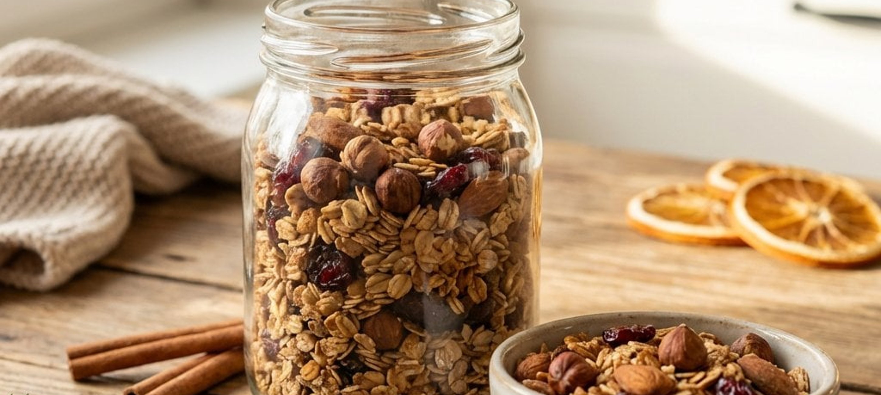 Serviere das Granola am besten mit cremigem Joghurt oder frischer Milch und ein paar Apfelspalten für das ultimative Weihnachtsfeeling.