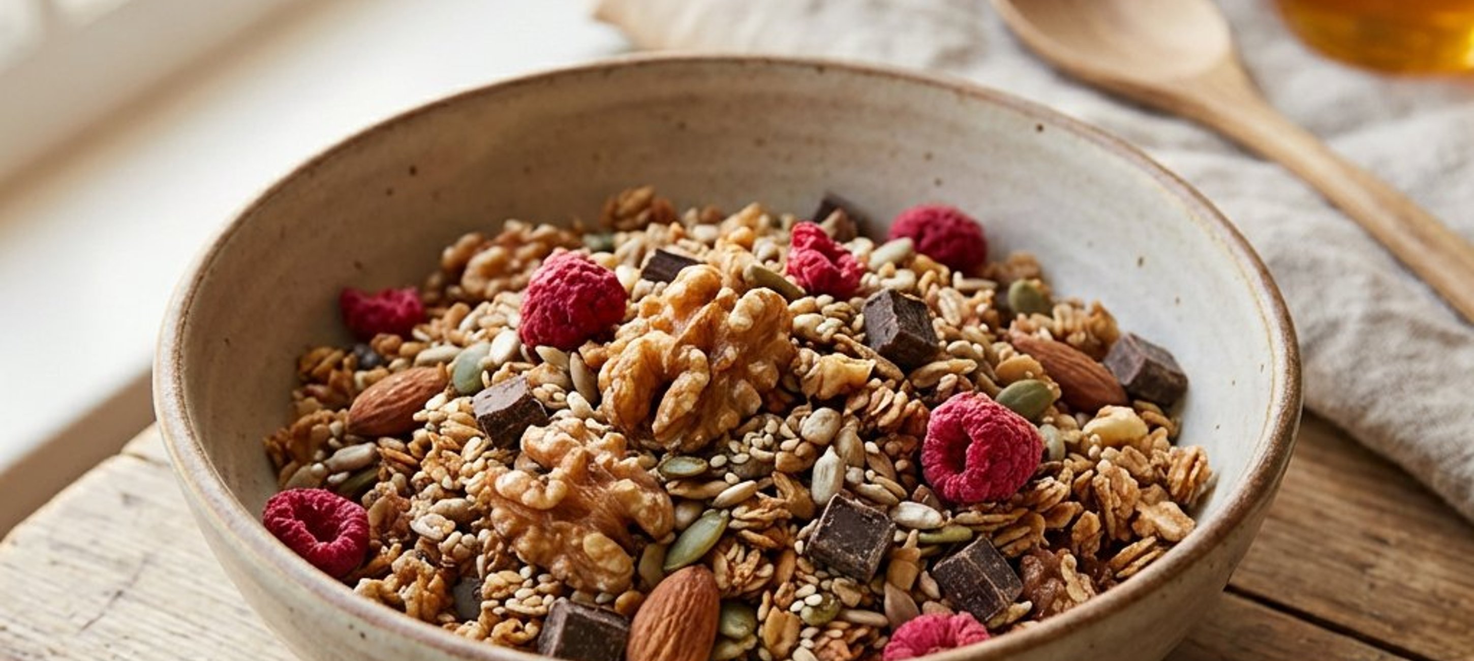 Servieren Sie die fertige Granola am besten mit frischem Naturjoghurt oder cremigem Topfen für ein proteinreiches Frühstück.