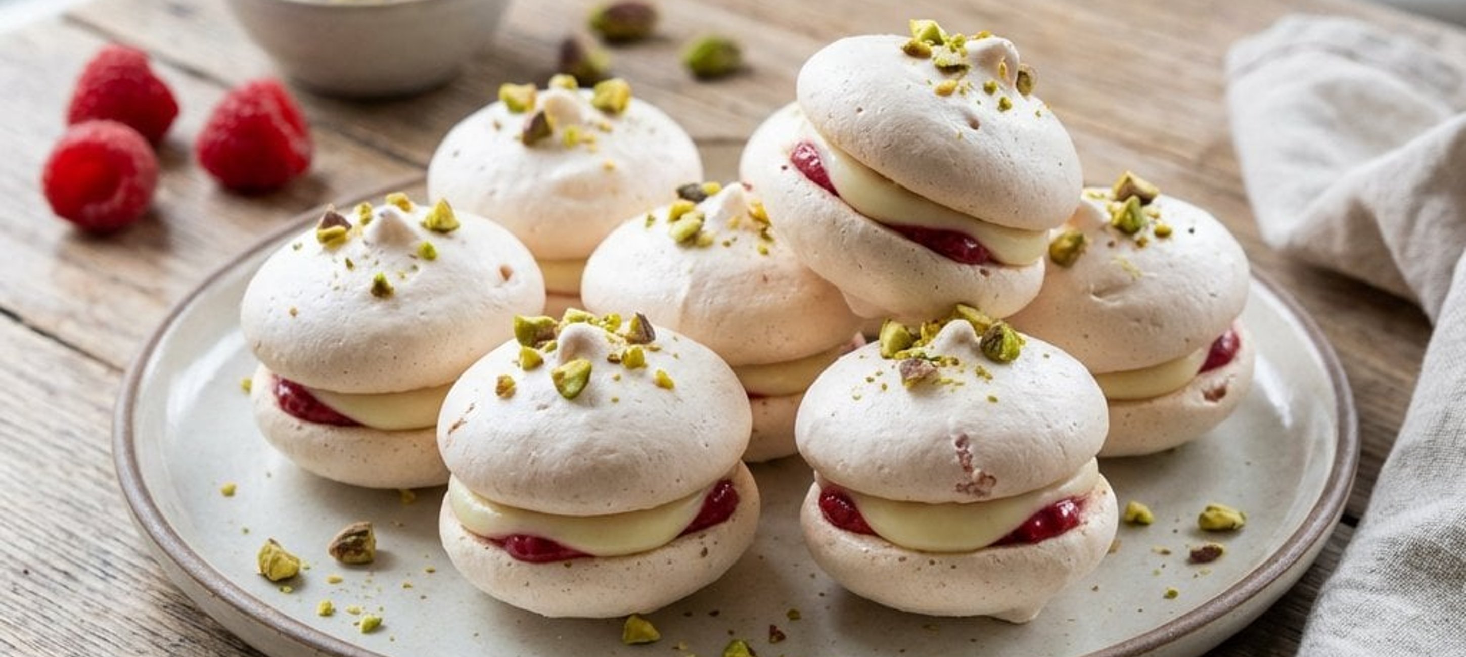 - 3Die Baisers nach Größe sortieren. Jeweils zwei Stück mit der Himbeercreme zusammensetzen (am besten einen Spritzbeutel mit Lochtülle verwenden).