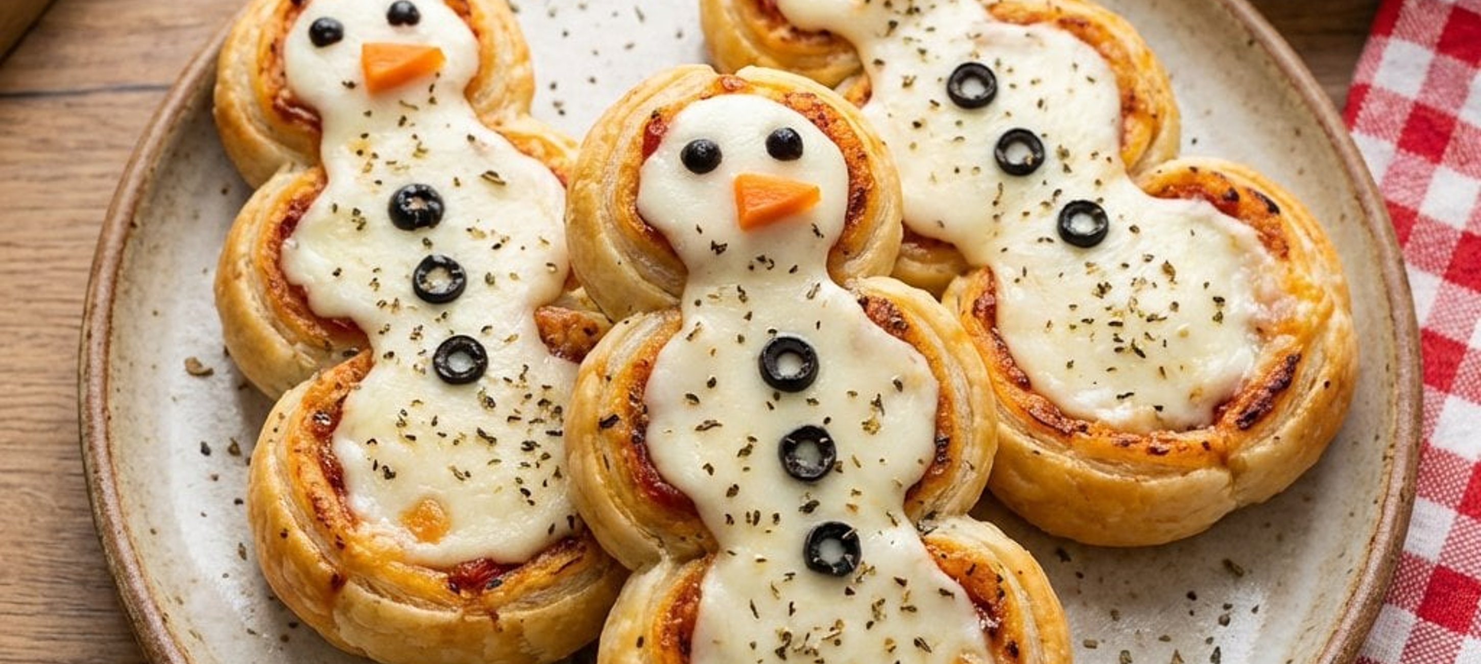 - 1Reiben Sie den Gouda fein und streuen Sie ihn großzügig über die Körper der Schneemänner (versuchen Sie, den Käse nur auf den Teigrädern zu platzieren).