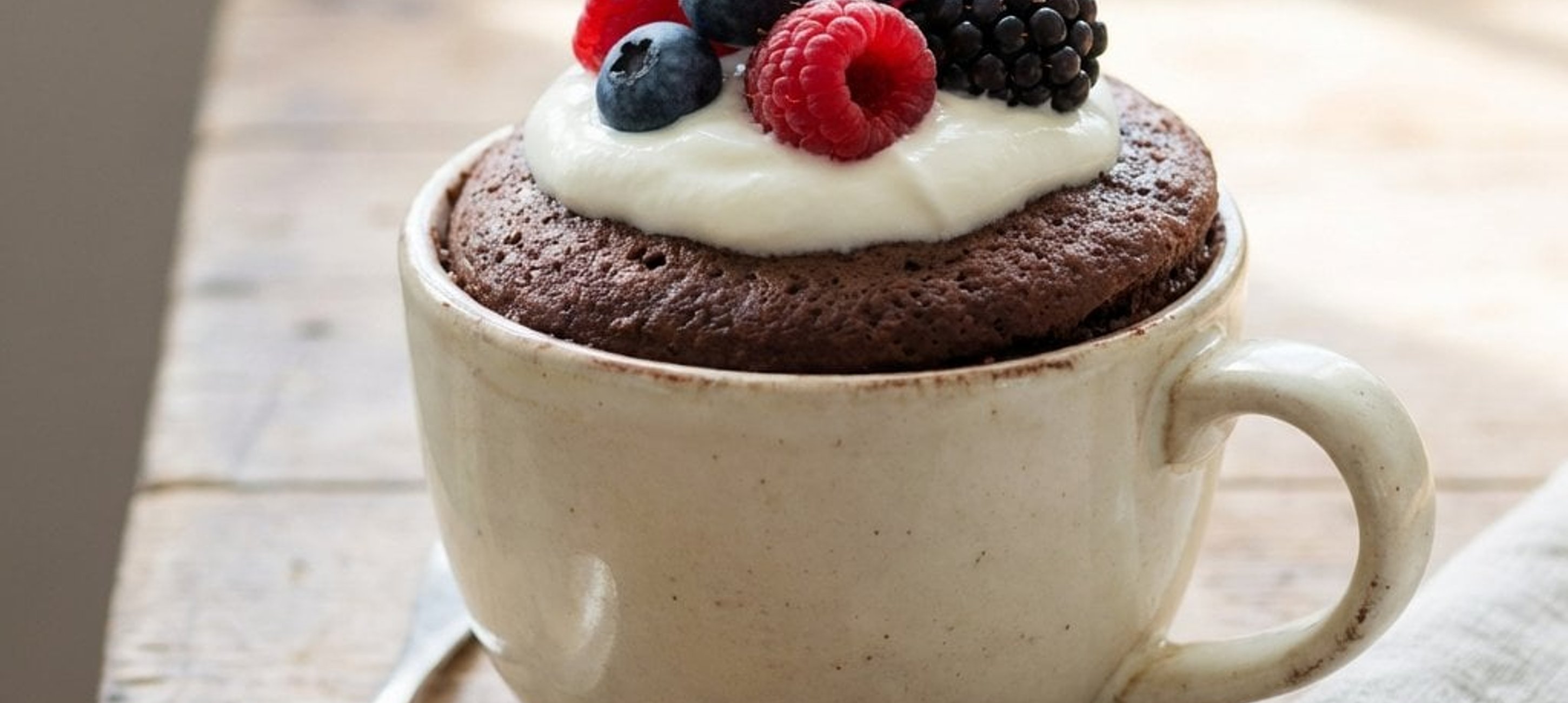 - 6Den Teig in die vorbereitete Tasse füllen. Den Rand der Tasse eventuell sauber wischen. Im vorgeheizten Ofen bei 180 °C für exakt 18 Minuten backen. Den Mug Cake am besten noch warm mit einem Klecks Sauerrahm und Beeren servieren.