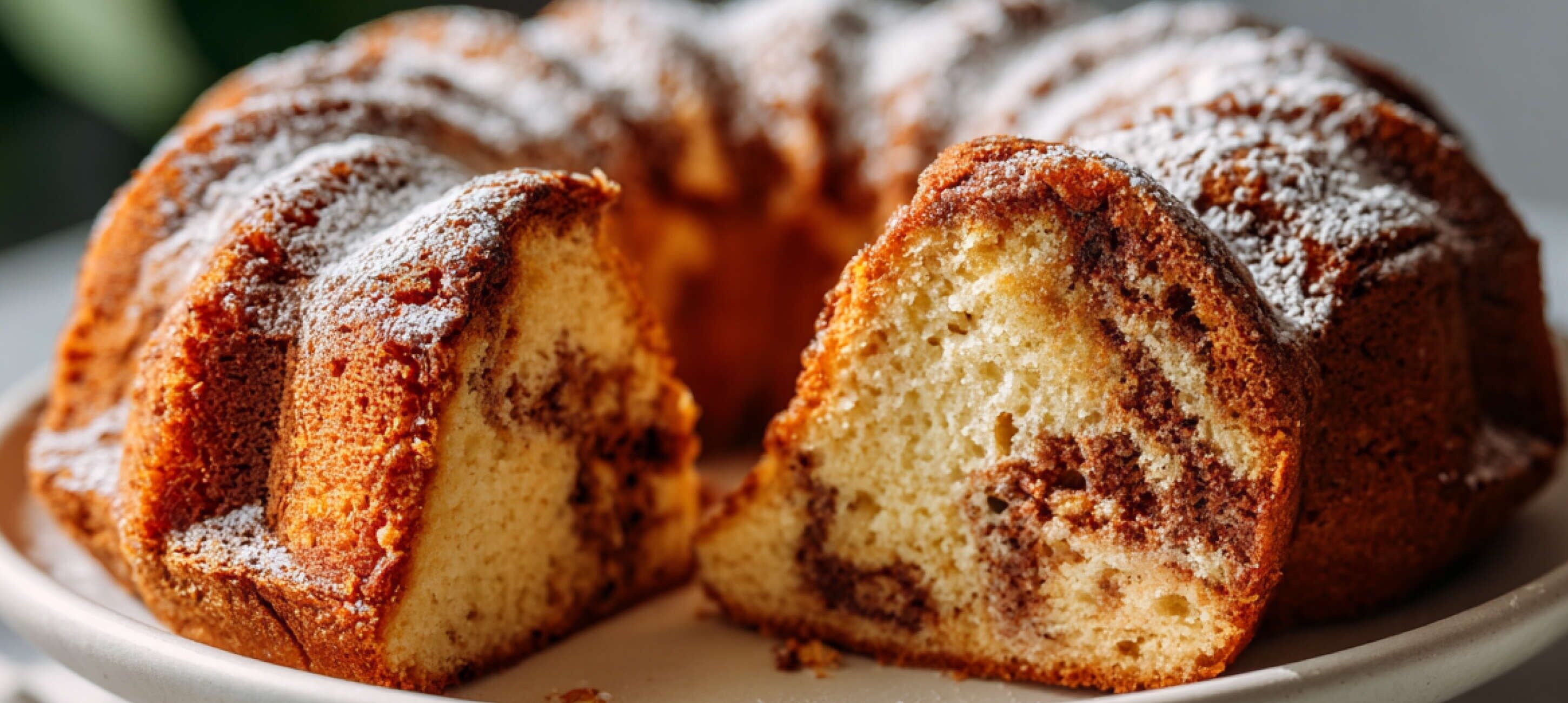 - 3Die Hälfte des Teigs in eine zweite Schüssel geben und Kakao sowie die 2 zusätzlichen Esslöffel Milch unterrühren. Abwechselnd hellen und dunklen Teig in die vorbereitete Form füllen und anschließend mit einem Messer leicht durchziehen, um ein Marmormuster zu erzeugen. Den Gugelhupf in den Ofen geben und 40–50 Minuten backen, bis ein Holzstäbchen sauber herauskommt.