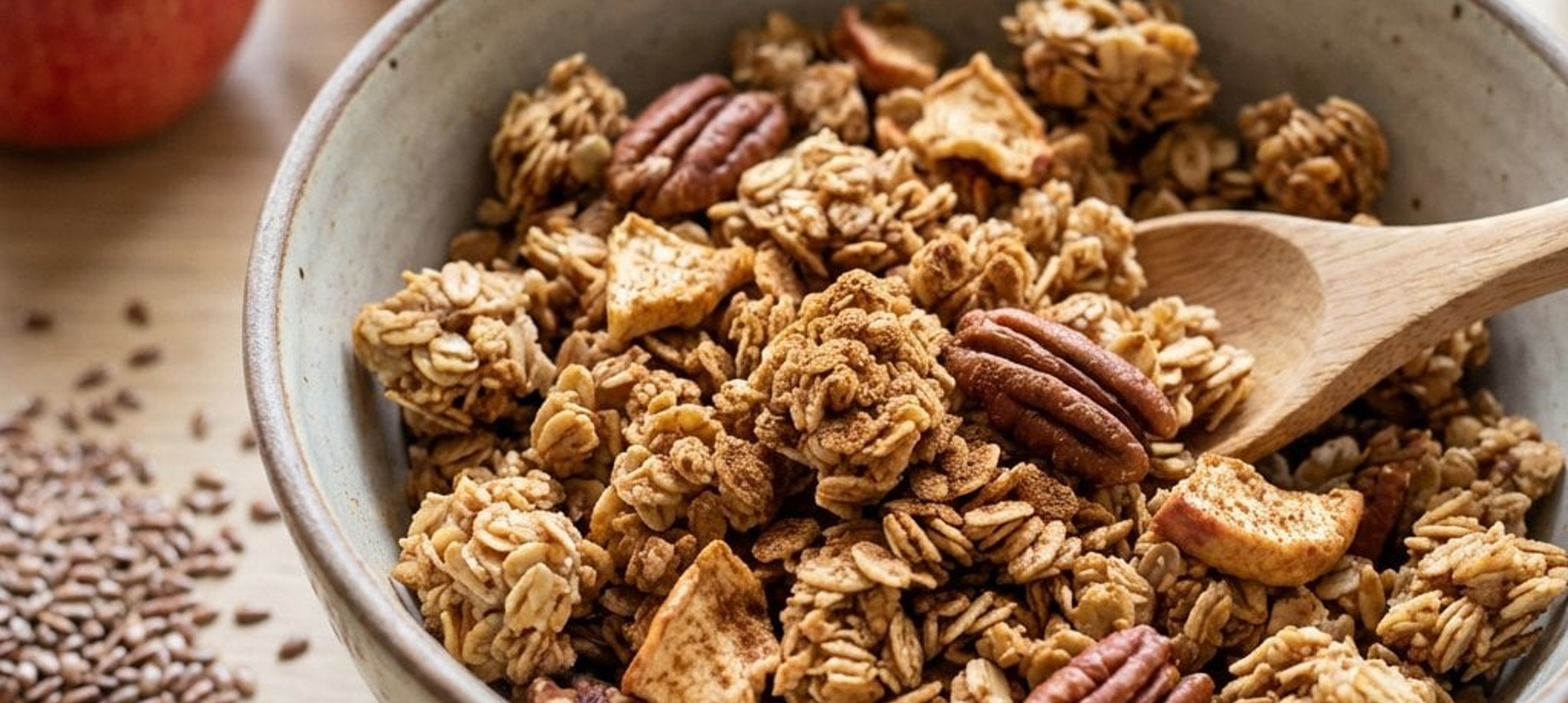 - 2In einer großen Schüssel die feinen Haferflocken mit den grob gehackten Pekannüssen, Leinsamen, Zichoriensirup und etwa einem Esslöffel Zimt vermengen. Das Apfelmus hinzufügen und alles gut verrühren, bis eine gleichmäßige Masse entsteht.