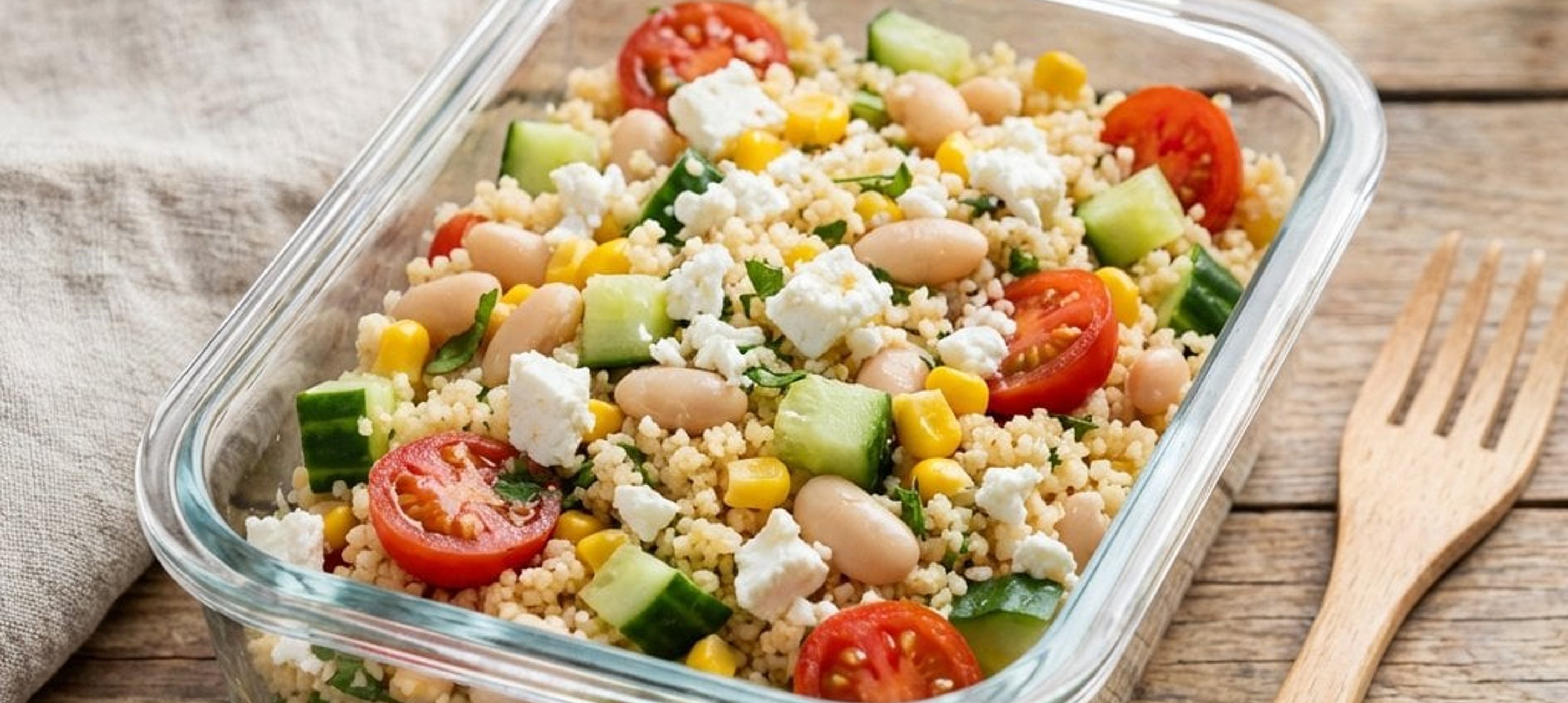 - 3Den fertigen Couscous mit einer Gabel auflockern. Mais und weiße Bohnen (vorher abspülen und abtropfen lassen), das frische Gemüse sowie den Käse vorsichtig unterheben. Alles in eine Lunchbox füllen und bis zum Verzehr kühl stellen.