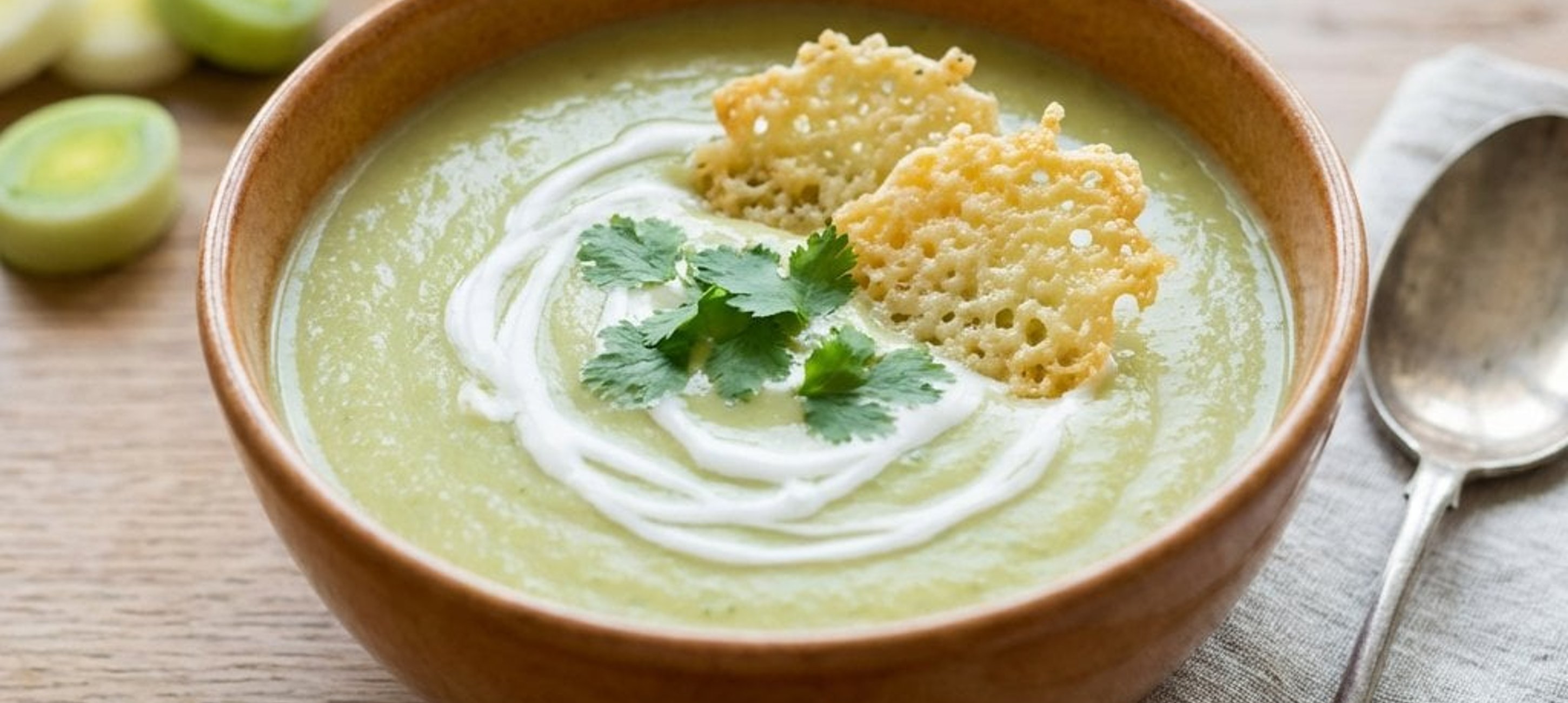 - 2Sobald die Erdäpfel gar sind, die Suppe mit einem Stabmixer fein pürieren. Die Kokosmilch unterrühren (ab jetzt nicht mehr kochen). Mit Salz und Pfeffer abschmecken. Den restlichen Koriander hacken und in die Suppe geben. Die cremige Lauchsuppe in Tellern anrichten und mit den knusprigen Parmesan-Chips servieren.