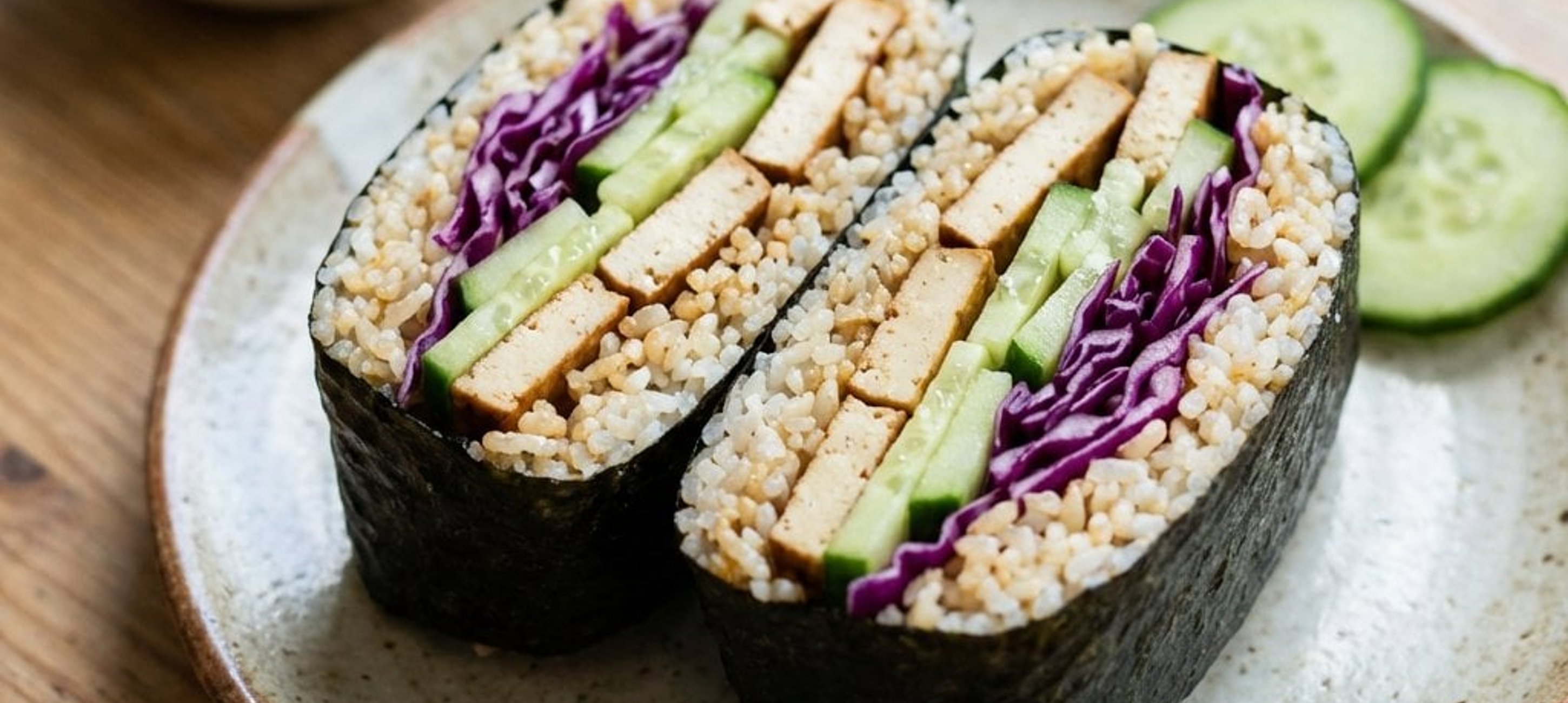 - 1Ein Blatt Nori mit der glänzenden Seite nach unten auf ein Stück Frischhaltefolie legen. In die Mitte eine Portion Reis geben und flach drücken. Darauf den marinierten Tofu, Gurkenscheiben und das Rotkraut schichten.