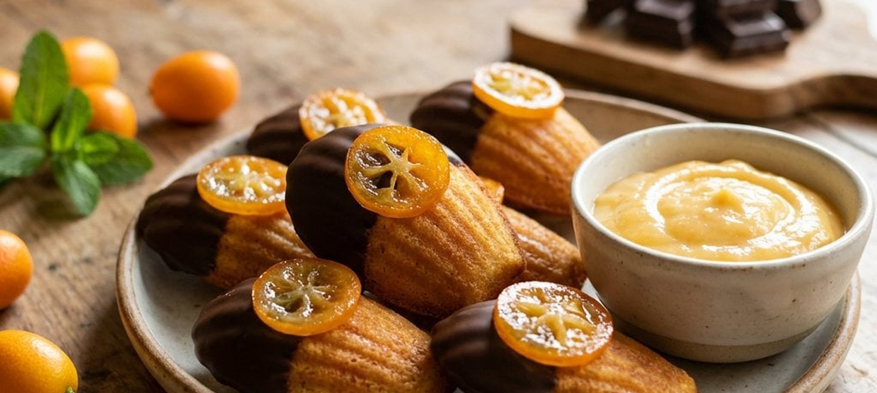 - 3Tauchen Sie die gefüllten Madeleines zur Hälfte in die Schokoladenglasur. Sobald die Glasur fest geworden ist, dekorieren Sie sie mit den beiseitegelegten Kumquat-Scheiben. (Tipp: Legen Sie die Früchte nicht auf die flüssige Glasur, da sie sonst die Schokolade aufsaugen und ihren Glanz verlieren würden.)