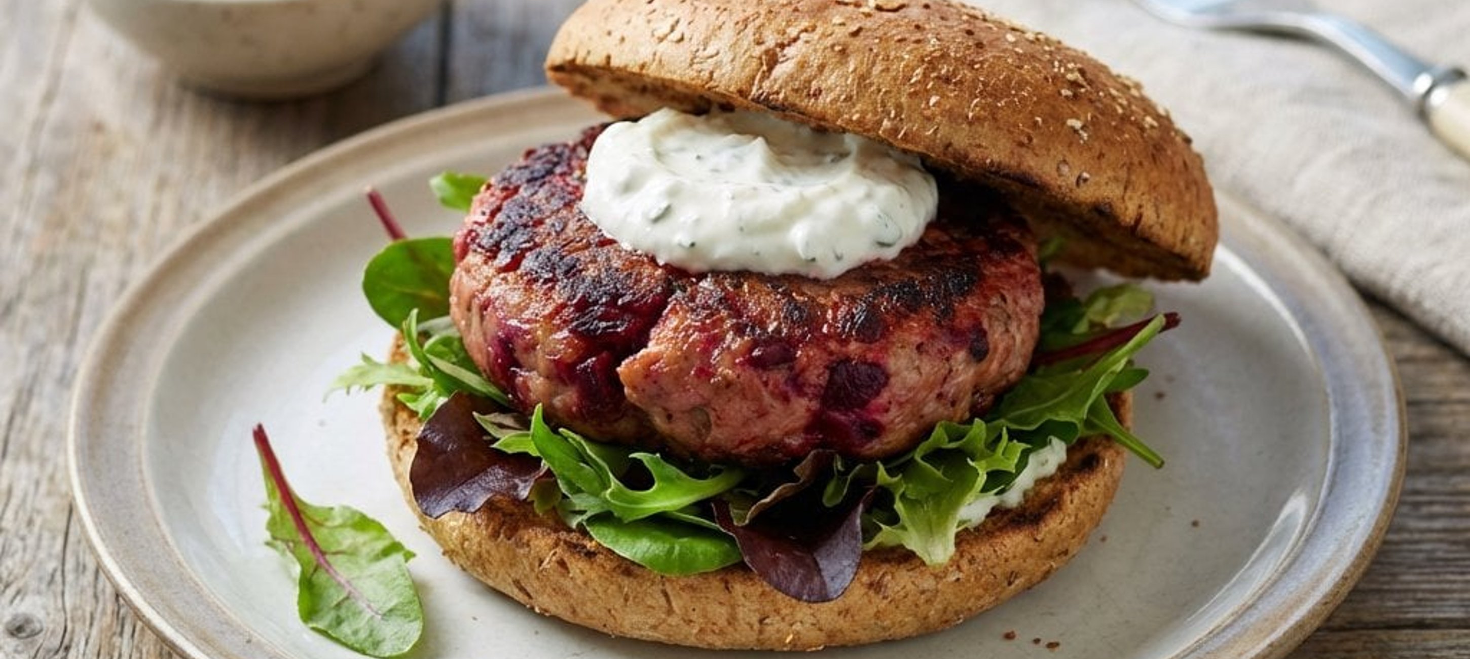- 3Den Burger wie folgt zusammenbauen: Auf die Unterseite der Semmel etwas Dip streichen, Salatblätter darauf verteilen, das Rote-Rüben-Patty auflegen, nochmals einen Klecks Dip und Salat hinzufügen und mit dem Semmeldeckel abschließen. Heiß servieren!