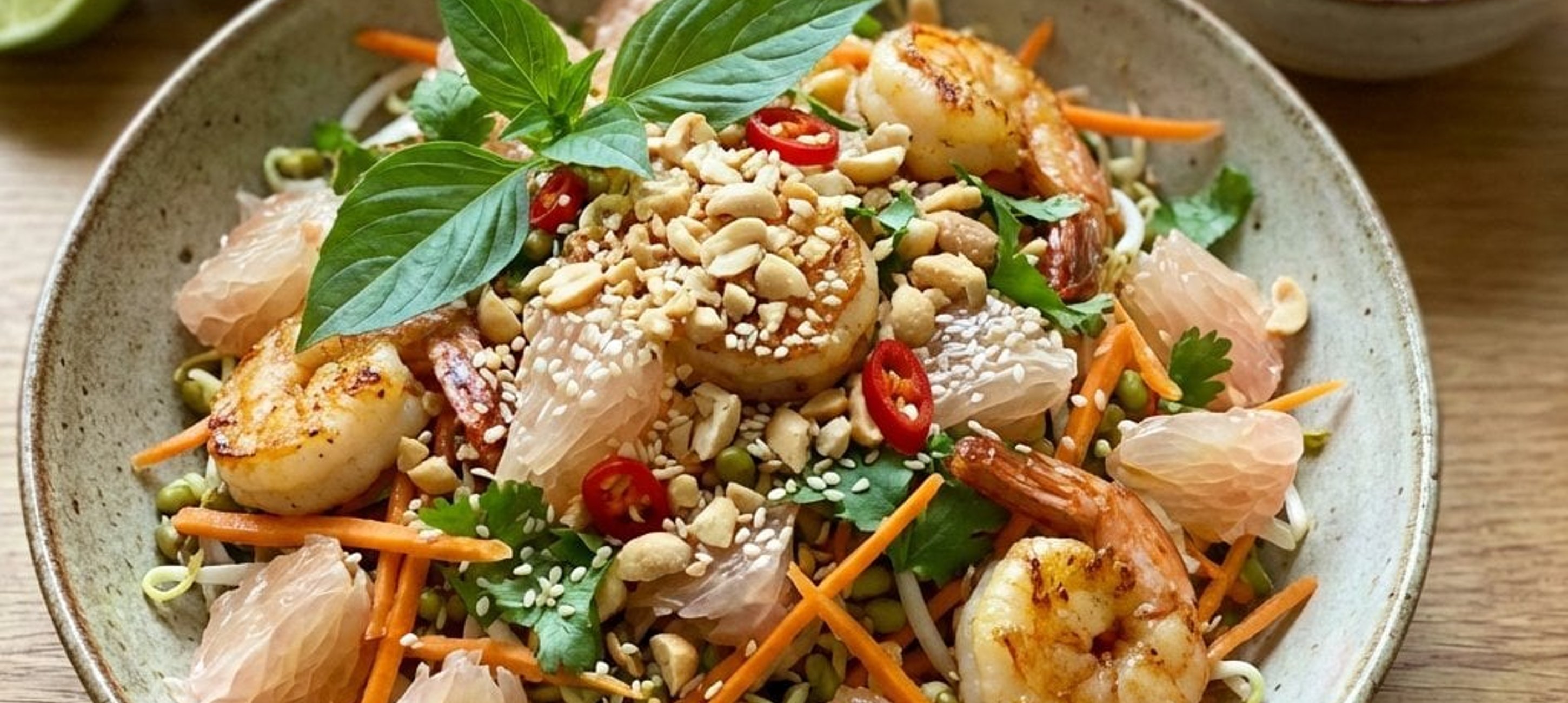 Ein kleiner Tipp: Wenn Sie die Pomelo-Stücke vorsichtig mit den Händen zerteilen, bleiben die Saftperlen intakt und sorgen für ein besonders saftiges Mundgefühl. Die Fischsauce verleiht dem Salat das authentische Umami-Aroma – fangen Sie mit etwas weniger
