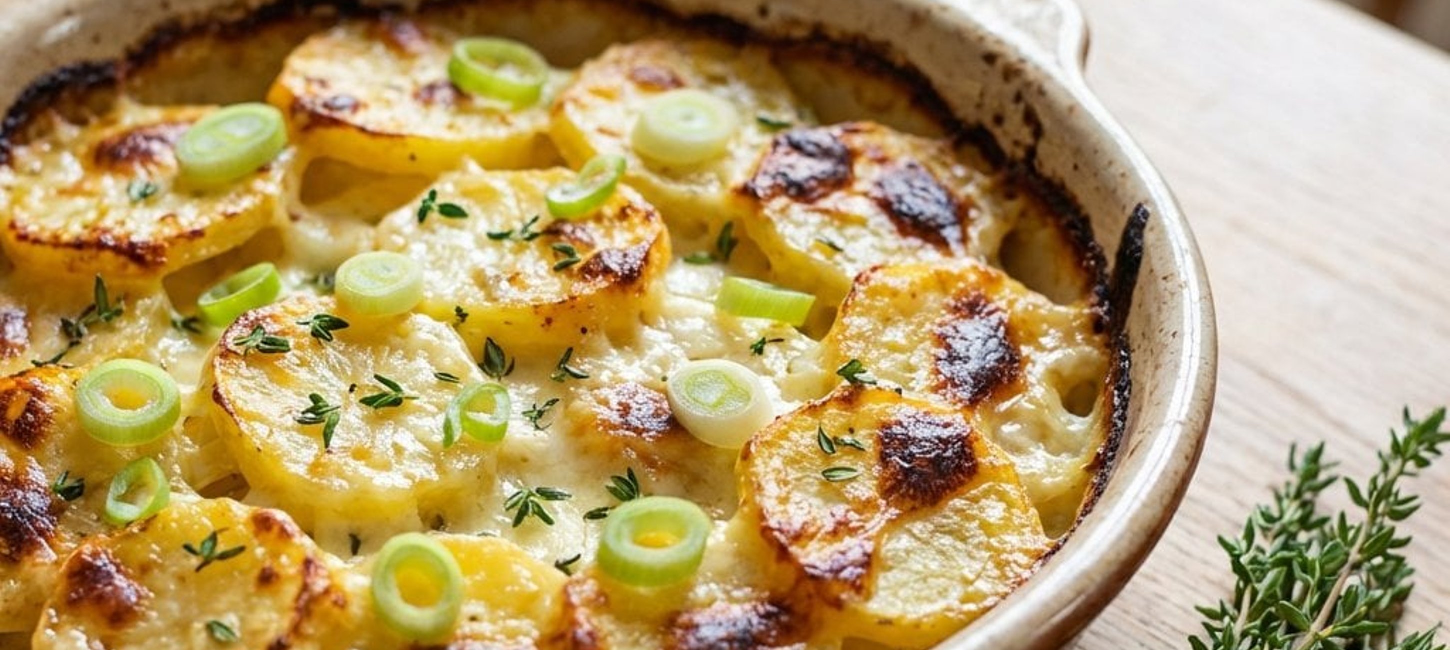 - 3Die vorbereitete Schafkäse-Obers-Mischung gleichmäßig über die Erdäpfel gießen. Das Gratin im vorgeheizten Ofen ca. 50–55 Minuten backen, bis die Erdäpfel weich sind und die Oberfläche goldbraun und knusprig ist. Vor dem Servieren kurz ruhen lassen.