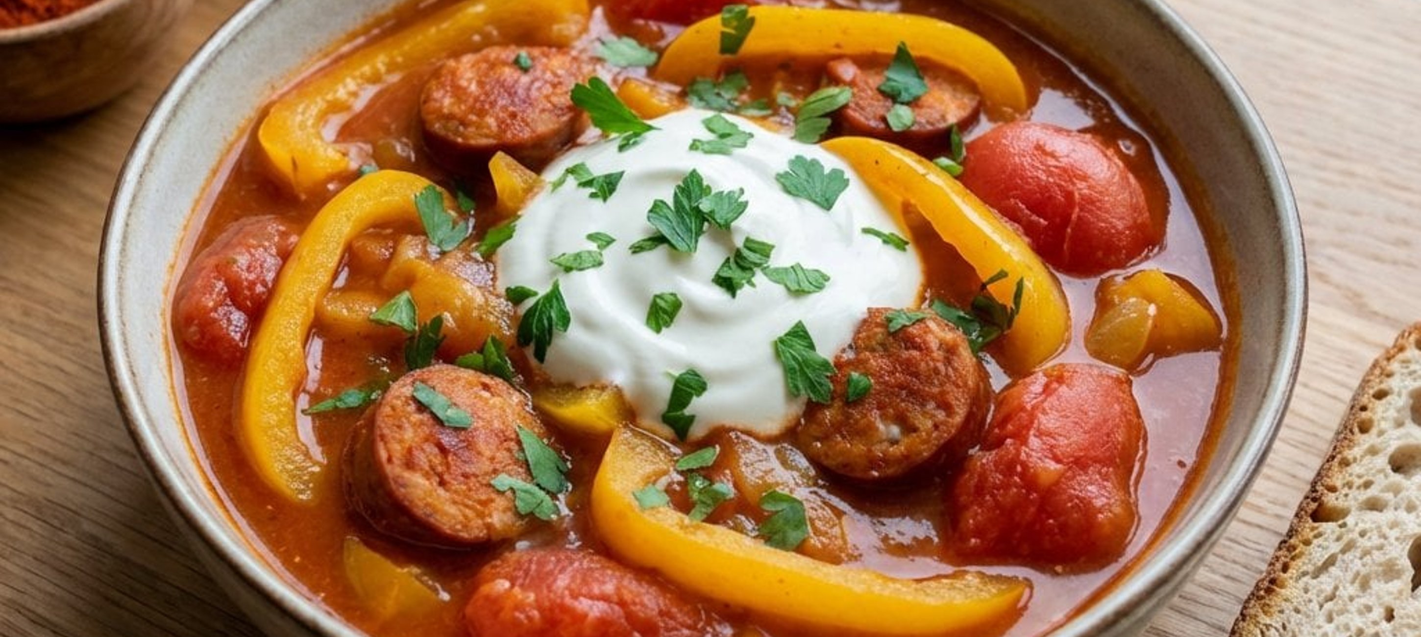 - 4Das Letscho heiß servieren, mit einem Klecks Sauerrahm garnieren und mit frischen Kaisersemmeln genießen.