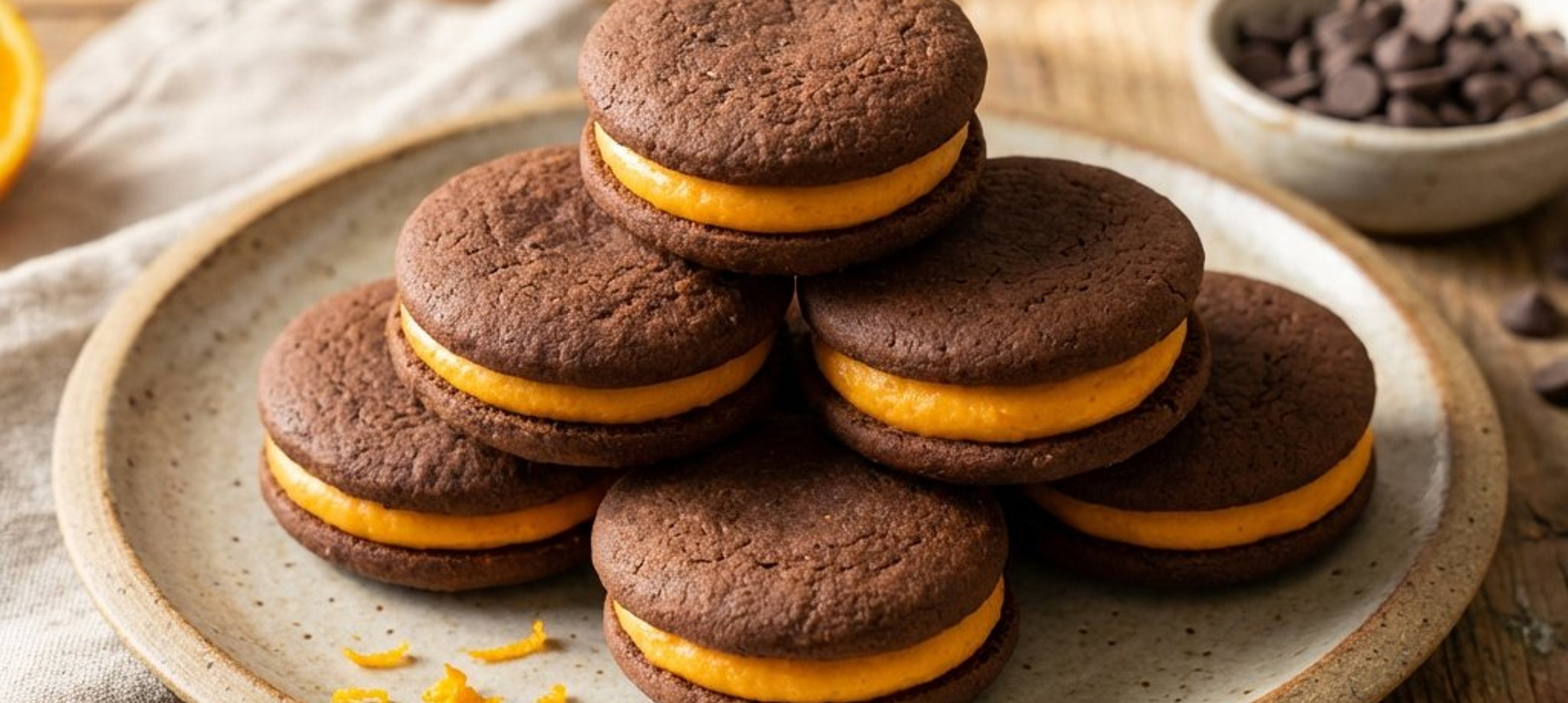 Ein kleiner Tipp: Wenn Sie die Cookies besonders rund haben möchten, bringen Sie sie direkt nach dem Backen mit einem runden Ausstecher in Form, solange sie noch weich sind. Die Orangencreme schmeckt am besten, wenn sie gut durchgekühlt ist!