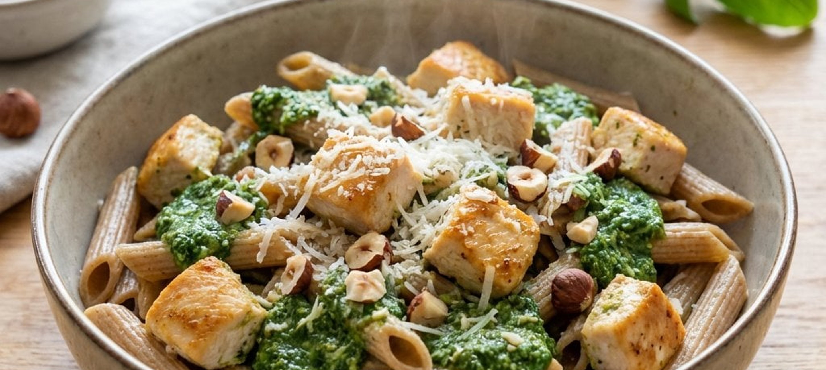 - 2Die gekochten Nudeln mit dem Spinatpesto und den Hendlwürfeln vermengen. Falls die Sauce zu dickflüssig ist, einen Schuss Nudelwasser hinzufügen. Auf Tellern anrichten und servieren.