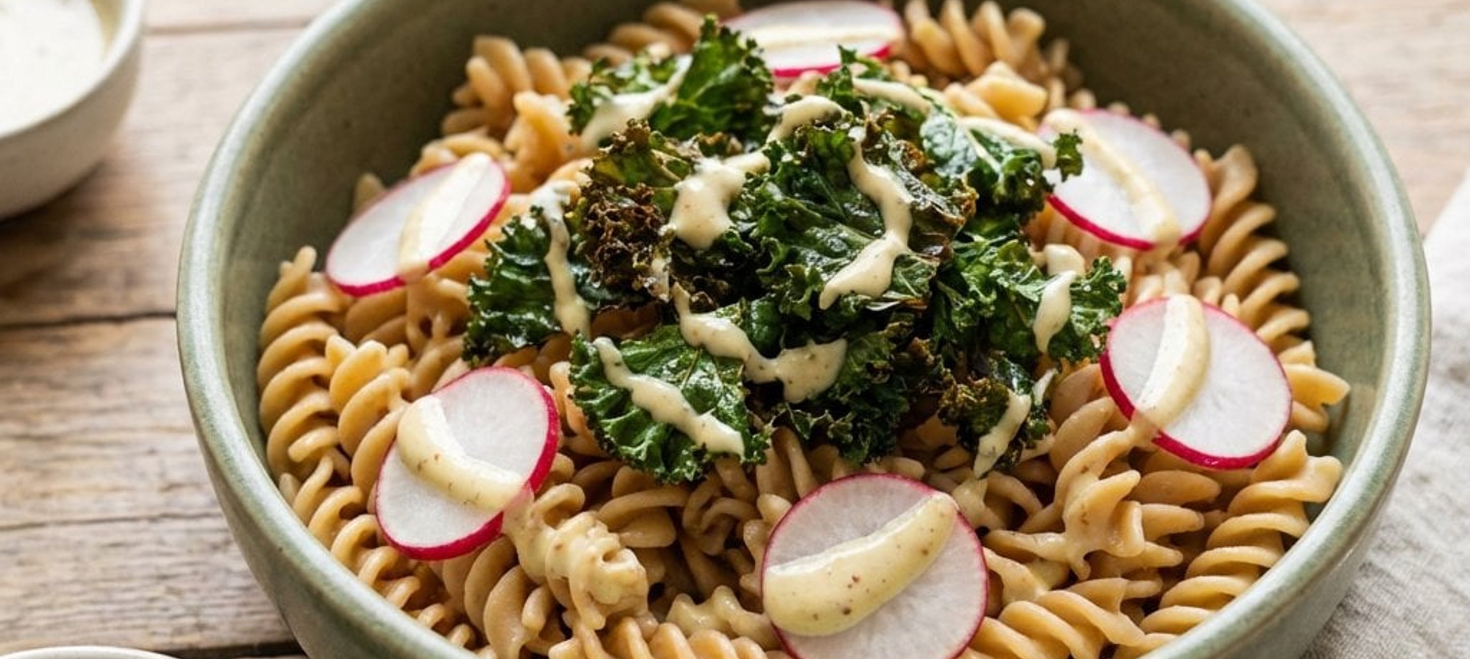 - 5Die fertige Pasta mit dem gerösteten Grünkohl und den Radieschen vermengen und gemeinsam mit dem cremigen Dip anrichten.
