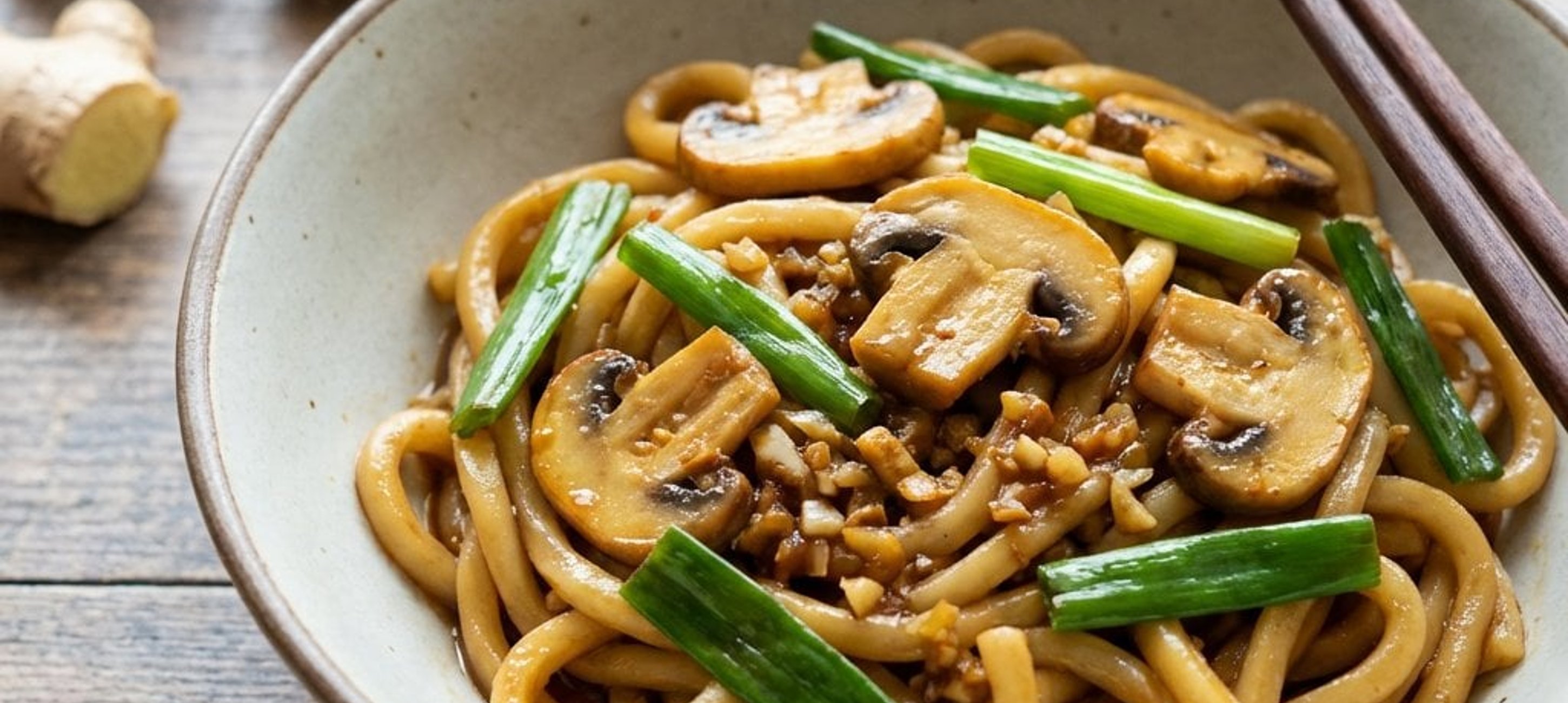 - 3Knoblauch und Ingwer fein hacken. Zu den Pilzen in die Pfanne geben. Den braunen Zucker und zwei Esslöffel Sojasauce hinzufügen. Die Jungzwiebeln in grobe Stücke schneiden, ebenfalls dazugeben und alles für eine weitere Minute gemeinsam anrösten.