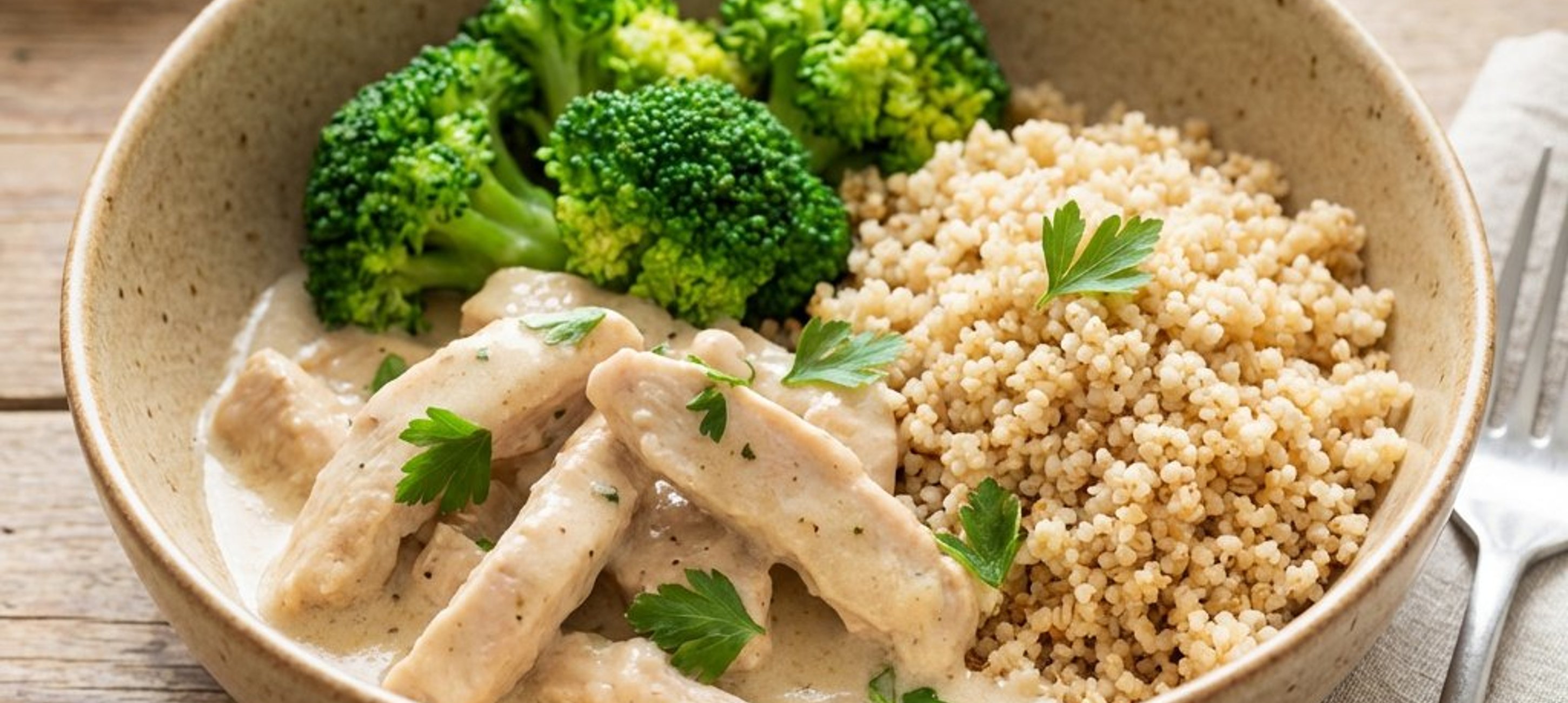 - 5Alles mit Sojasahne aufgießen, den gekochten Brokkoli unterrühren und die gesamte Mischung noch ca. 3 Minuten bei geringer Hitze erwärmen. Die Puten-Pfanne zusammen mit dem Couscous servieren.