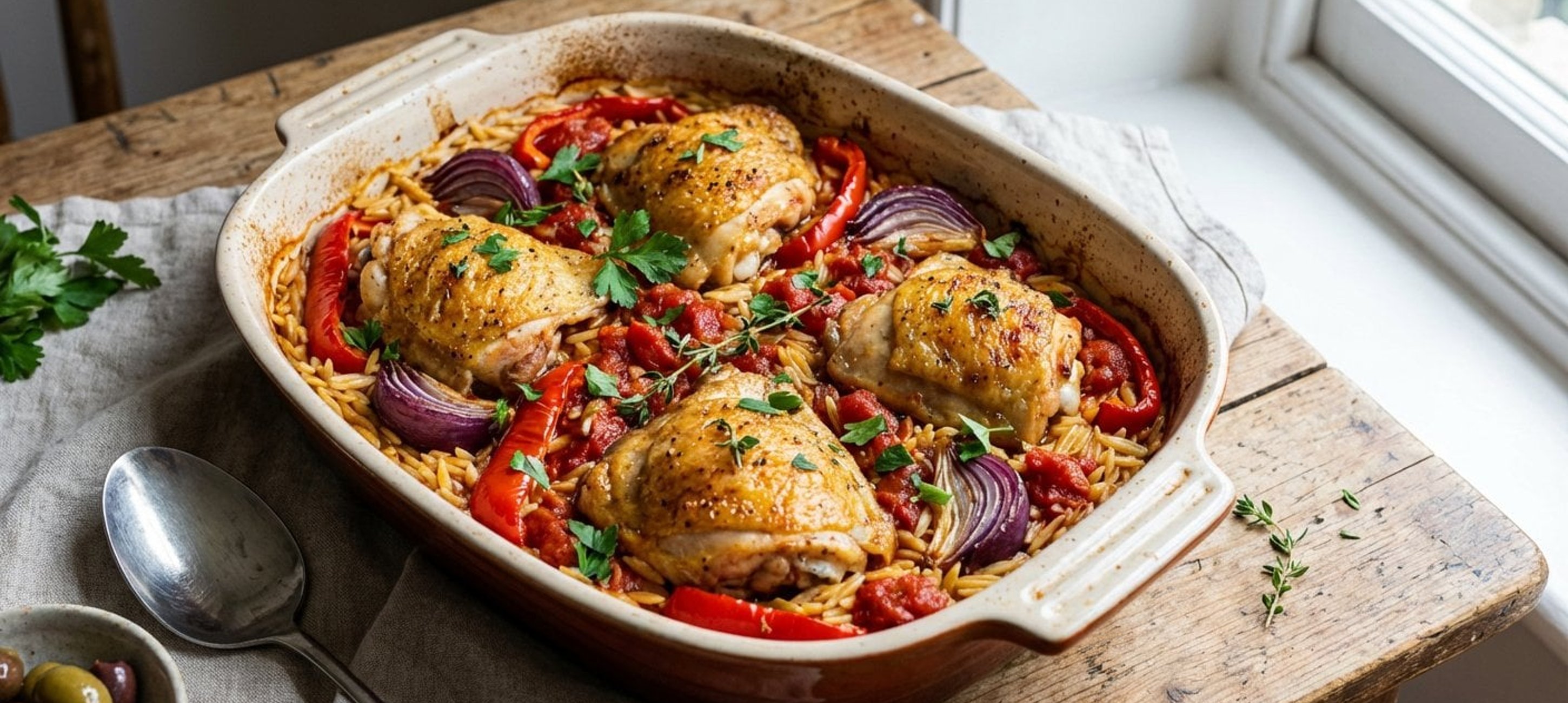 - 5Nach 10 Minuten die Sauce mit Salz und Pfeffer abschmecken. Die Orzo-Pasta (Risoni) unterrühren und die gesamte Mischung in die Auflaufform füllen. Die angebratenen Hühnerkeulen obenauf legen. Im vorgeheizten Ofen bei 180 °C ca. 20 Minuten backen. Danach die Temperatur auf 220 °C erhöhen und weitere 10 Minuten knusprig fertig braten.