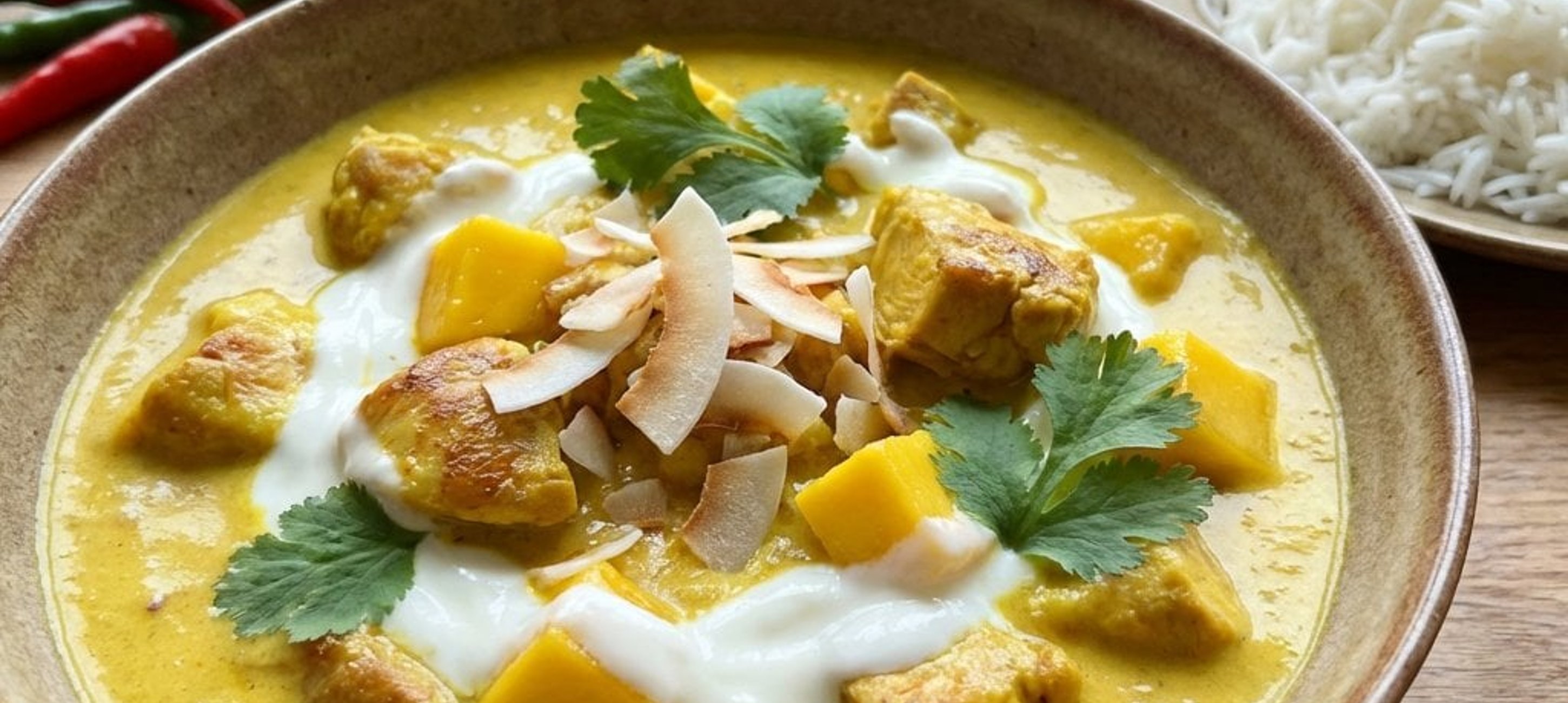 - 3Die Currypaste in die Pfanne geben, eine minute unter Rühren anrösten, bis sie duftet. Mit Hühnerfond ablöschen und den Bratensatz lösen. Das angebratene Fleisch sowie die Mango-Kokos-Mischung hinzufügen. Alles gut vermengen, den Deckel aufsetzen und bei geringer Hitze 15–20 Minuten köcheln lassen.