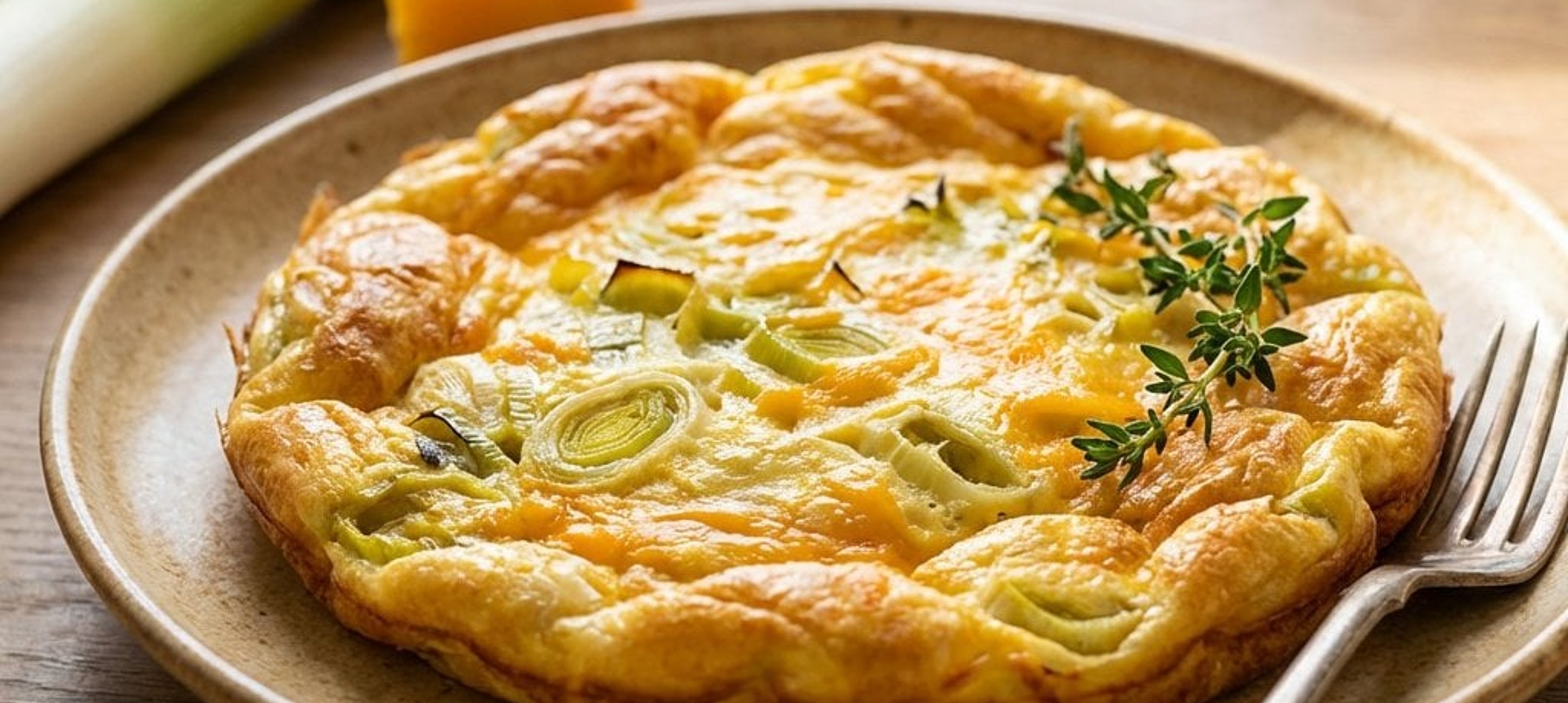 - 5Sobald die Lauchmischung fertig gedünstet ist, gießen Sie die Eiermasse direkt in die Pfanne. Schalten Sie den Herd aus und stellen Sie die Pfanne sofort in den vorgeheizten Ofen. Backen Sie die Frittata für 17–18 Minuten bei 185–190 °C, bis sie goldbraun und fest ist.