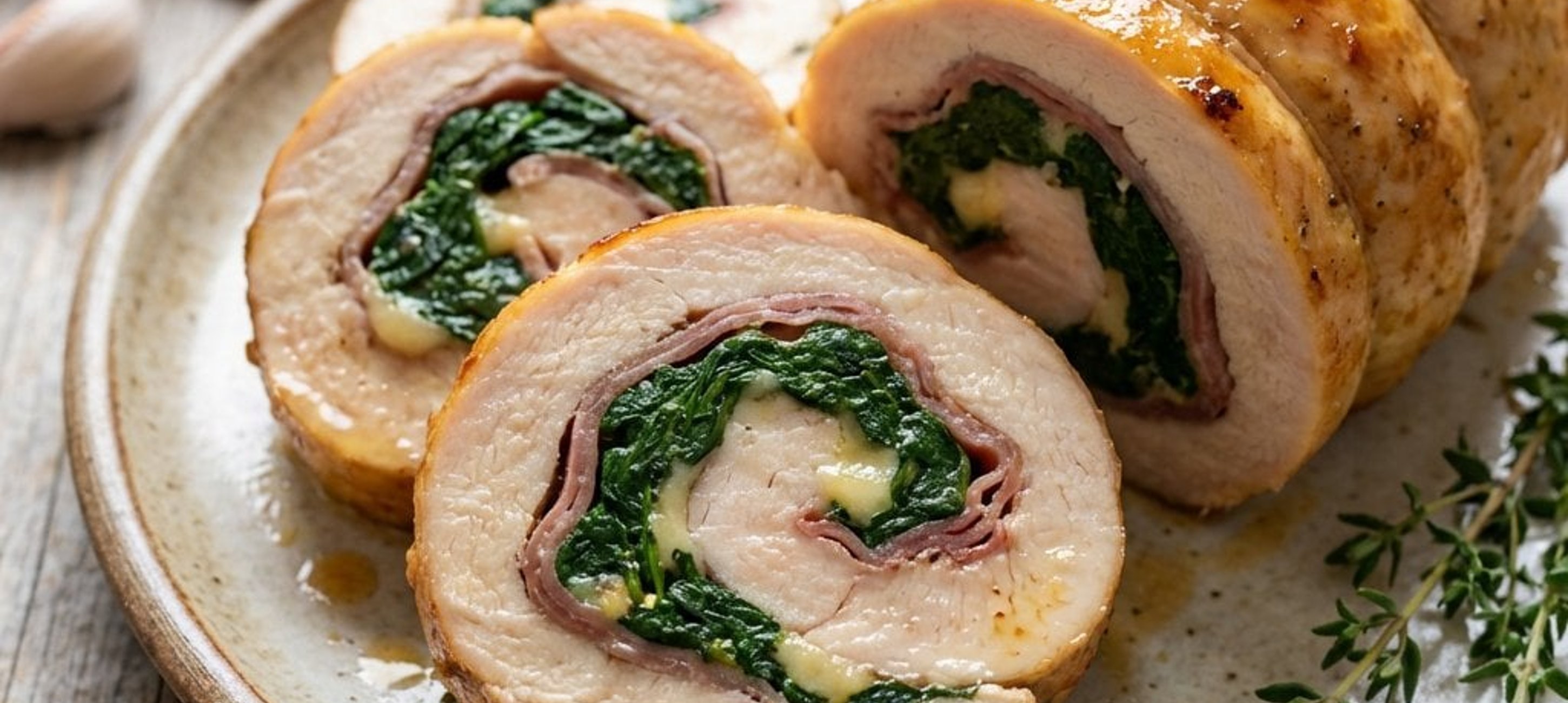 - 5Nach der Garzeit die Roulade vorsichtig aus der Folie wickeln. Die Ofentemperatur auf 220–225 °C erhöhen und die Roulade weitere 15–20 Minuten offen backen, bis sie eine schöne goldbraune Farbe annimmt. Vor dem Aufschneiden kurz ruhen lassen und servieren.