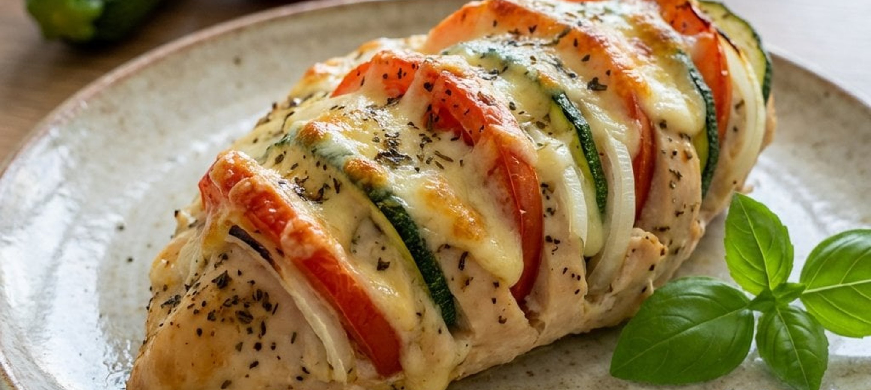 - 3Würze das Fleisch großzügig mit Salz und Pfeffer. Stecke in jeden Einschnitt abwechselnd eine halbe Scheibe Zucchini, Zwiebel und Paradeiser. Träufle das Olivenöl über die vorbereiteten Hendlbrüste und bestreue sie mit der italienischen Kräutermischung.