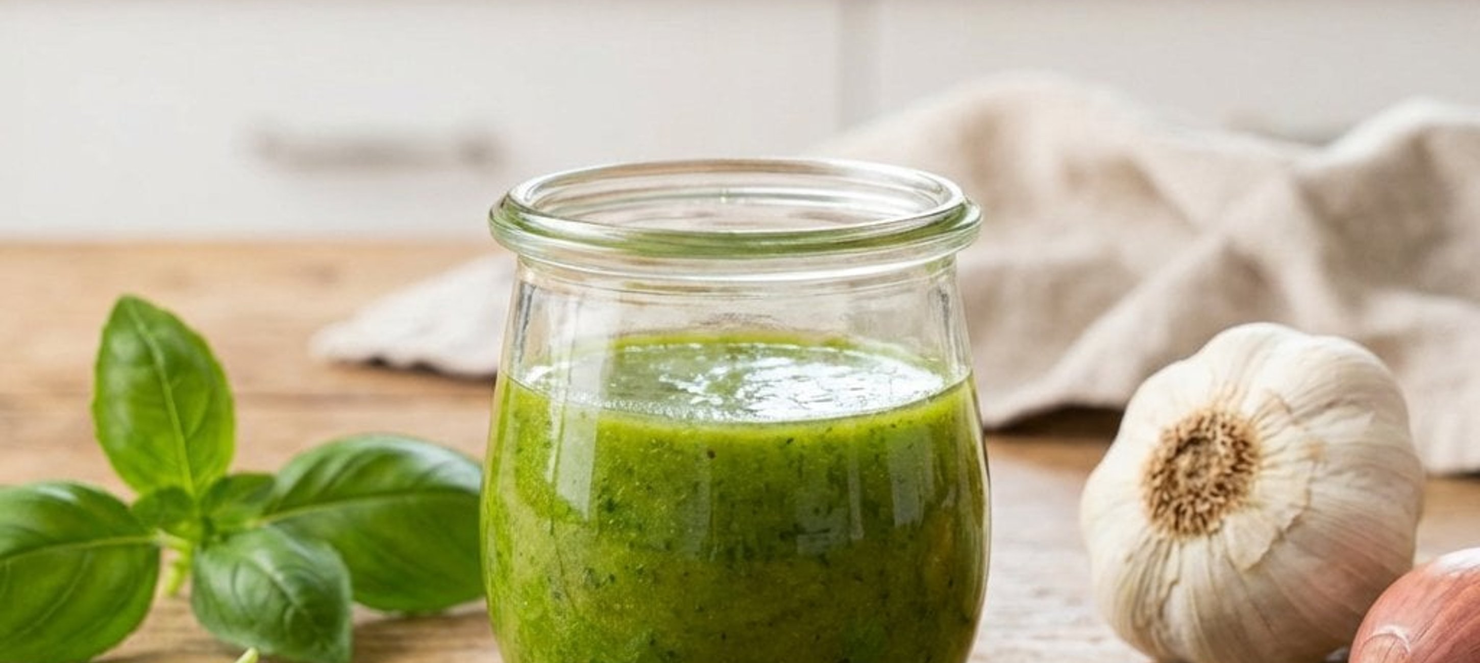 - 2Knoblauch, Schalotten, Basilikum, Zitronensaft, Apfelessig und das native Olivenöl extra in einen Standmixer oder ein hohes Gefäß geben.