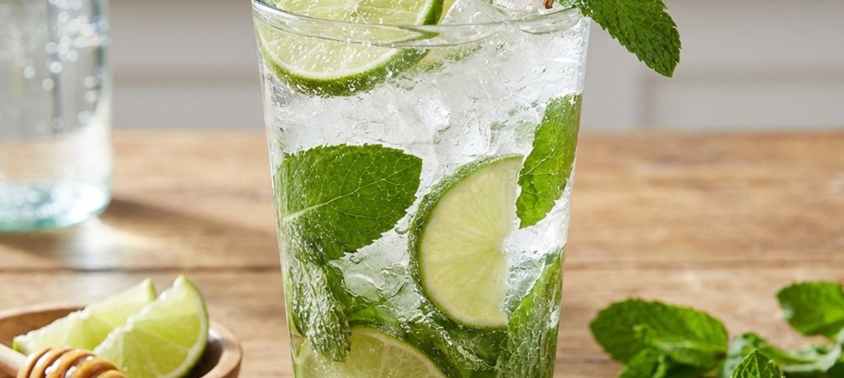 Verwenden Sie für ein besonders intensives Aroma Bio-Limetten und reiben Sie die Schale kurz an, bevor Sie sie ins Glas geben. Ein langer Barlöffel hilft dabei, den Honig am Boden gut mit dem Mineralwasser zu vermischen.