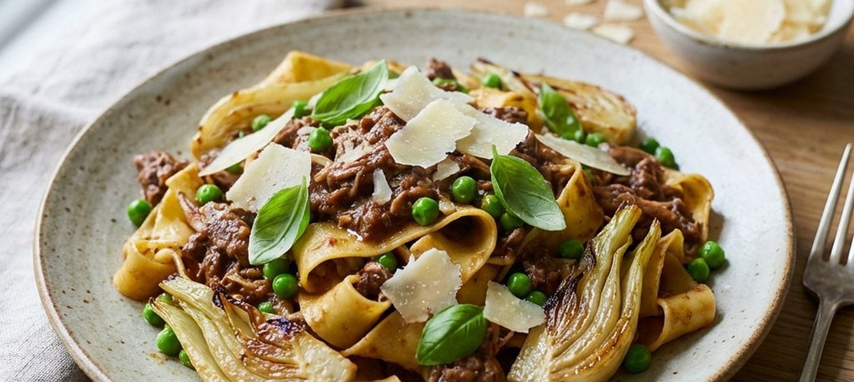 - 4Die Pappardelle nach Packungsanweisung al dente kochen. Die heißen Nudeln direkt mit dem Kaninchenragout vermengen. Mit den karamellisierten Fenchelspalten, den Erbsen und frischem Basilikum anrichten. Vor dem Servieren großzügig mit frisch geriebenem Parmesan bestreuen.